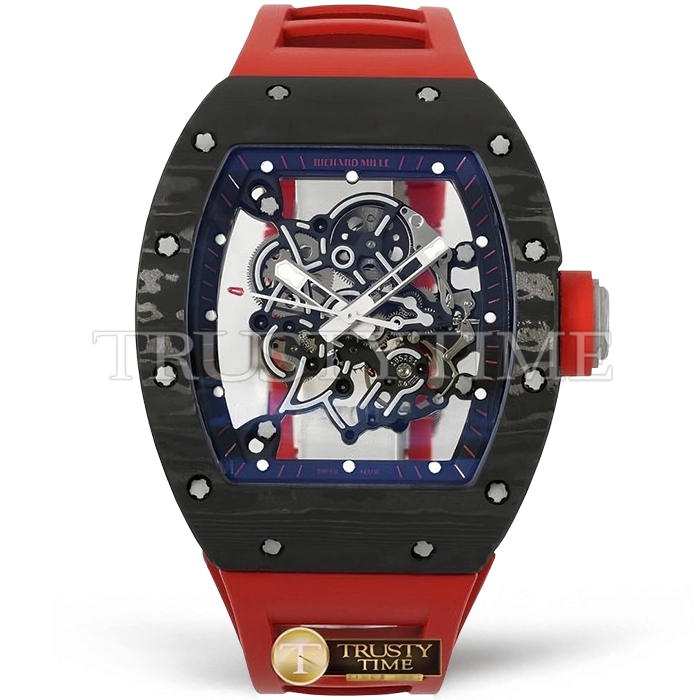 Часы Richard Mille из коллекции RM055. Спортивные мужские часы Richard Mille RM055 Bubba Watson премиального качества (Артикул магазина: RM-0593) оснащены надежным автоматическим механизмом с ручным заводом калибра RMUL2, в котором реализованы следующие функции: часовая, минутная и секундная стрелки, а так же максимально простой функционал без усложнений. Бочкообразный корпус часов черного цвета, имеющий размер 49.9 мм x 42.7 мм и высоту 13.5 мм превосходно дополнит образ и украсит запястье своего обладателя. Для изготовления часов Richard Mille RM055 Bubba Watson предлагаемых в нашем интернет-магазине, применяются карбон NTPT высокого качества (Швейцарский стандарт), а так же сапфировое стекло высокой прочности, благодаря чему обеспечивается максимальная защита от сколов и механических повреждений. Отличительной чертой данной модели является скелетонизированный циферблат, часовые индексы которого обеспечивают часовые метки. Завершает образ каучуковый ремешок красного цвета с фирменной раскладывающейся застежкой Richard Mille. Водонепроницаемость данной модели составляет 30М (WR30) – допускается минимальное воздействие с водой.