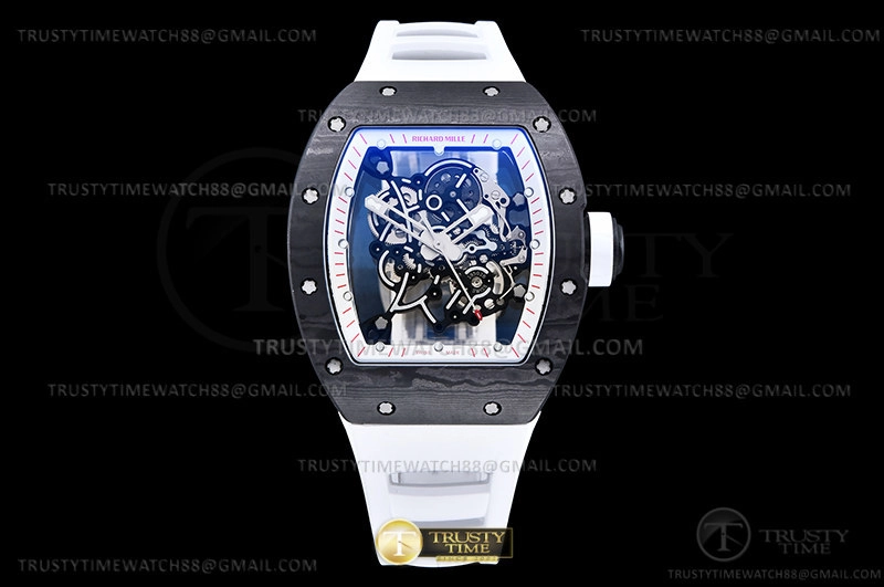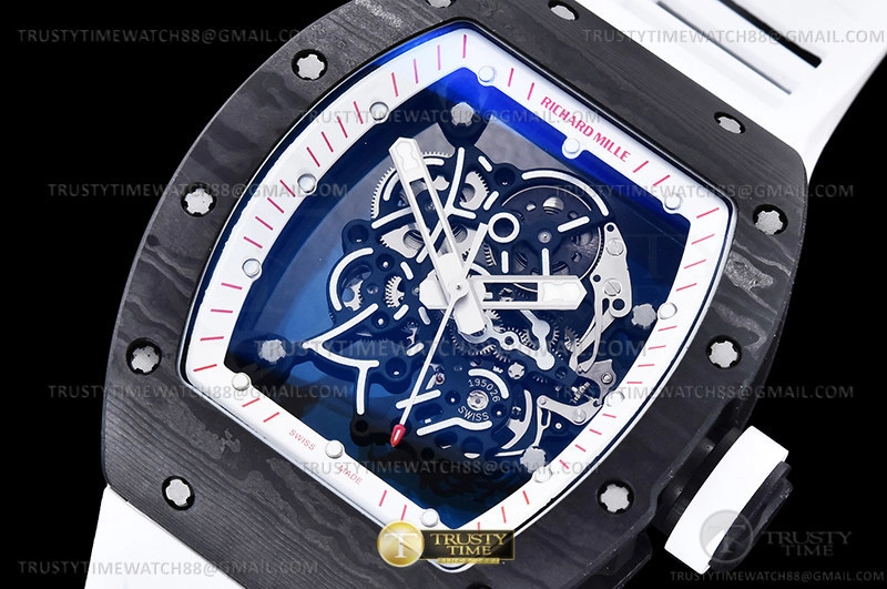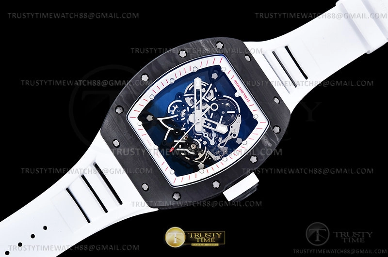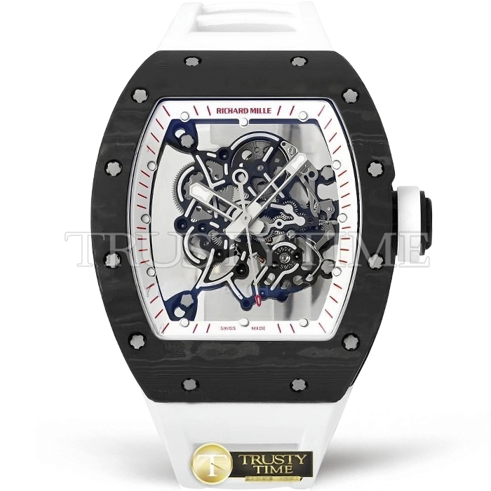 Часы Richard Mille из коллекции RM055. Спортивные мужские часы Richard Mille RM055 Bubba Watson премиального качества (Артикул магазина: RM-0594) оснащены надежным автоматическим механизмом с ручным заводом калибра RMUL2, в котором реализованы следующие функции: часовая, минутная и секундная стрелки, а так же максимально простой функционал без усложнений. Бочкообразный корпус часов черного цвета, имеющий размер 49.9 мм x 42.7 мм и высоту 13.5 мм превосходно дополнит образ и украсит запястье своего обладателя. Для изготовления часов Richard Mille RM055 Bubba Watson предлагаемых в нашем интернет-магазине, применяются карбон NTPT высокого качества (Швейцарский стандарт), а так же сапфировое стекло высокой прочности, благодаря чему обеспечивается максимальная защита от сколов и механических повреждений. Отличительной чертой данной модели является скелетонизированный циферблат, часовые индексы которого обеспечивают часовые метки. Завершает образ каучуковый ремешок белого цвета с фирменной раскладывающейся застежкой Richard Mille. Водонепроницаемость данной модели составляет 30М (WR30) – допускается минимальное воздействие с водой.