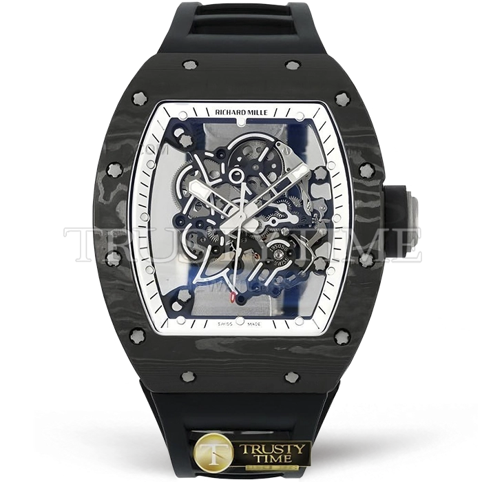 Часы Richard Mille из коллекции RM055. Спортивные мужские часы Richard Mille RM055 Bubba Watson премиального качества (Артикул магазина: RM-0600) оснащены надежным автоматическим механизмом с ручным заводом калибра RMUL2, в котором реализованы следующие функции: часовая, минутная и секундная стрелки, а так же максимально простой функционал без усложнений. Бочкообразный корпус часов черного цвета, имеющий размер 49.9 мм x 42.7 мм и высоту 13.5 мм превосходно дополнит образ и украсит запястье своего обладателя. Для изготовления часов Richard Mille RM055 Bubba Watson предлагаемых в нашем интернет-магазине, применяются карбон NTPT высокого качества (Швейцарский стандарт), а так же сапфировое стекло высокой прочности, благодаря чему обеспечивается максимальная защита от сколов и механических повреждений. Отличительной чертой данной модели является скелетонизированный циферблат, часовые индексы которого обеспечивают часовые метки. Завершает образ каучуковый ремешок черного цвета с фирменной раскладывающейся застежкой Richard Mille. Водонепроницаемость данной модели составляет 30М (WR30) – допускается минимальное воздействие с водой.