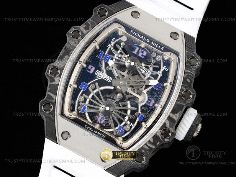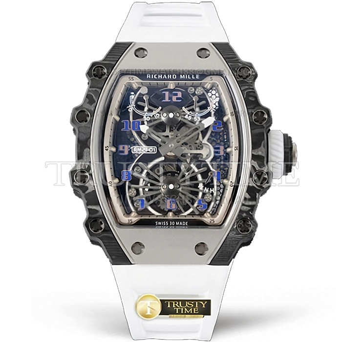 Часы Richard Mille из коллекции RM21-01. Классические мужские часы Richard Mille RM21-01 Tourbillon Aerodyne премиального качества (Артикул магазина: RM-0556) оснащены надежным автоматическим механизмом с ручным заводом калибра Seagull Handwind Tourbillon, в котором реализованы следующие функции: часова и минутка стрелки, а так же турбийон. Бочкообразный корпус часов черного цвета, имеющий размер 51 мм x 43 мм и высоту 16.5 мм превосходно дополнит образ и украсит запястье своего обладателя. Для изготовления часов Richard Mille RM21-01 Tourbillon Aerodyne предлагаемых в нашем интернет-магазине, применяются карбон NTPT высокого качества (Швейцарский стандарт), а так же сапфировое стекло высокой прочности, благодаря чему обеспечивается максимальная защита от сколов и механических повреждений. Отличительной чертой данной модели является скелетонизированный циферблат, часовые индексы которого обеспечивают арабские цифры. Завершает образ каучуковый ремешок белого цвета с фирменной раскладывающейся застежкой Richard Mille. Водонепроницаемость данной модели составляет 30М (WR30) – допускается минимальное воздействие с водой.