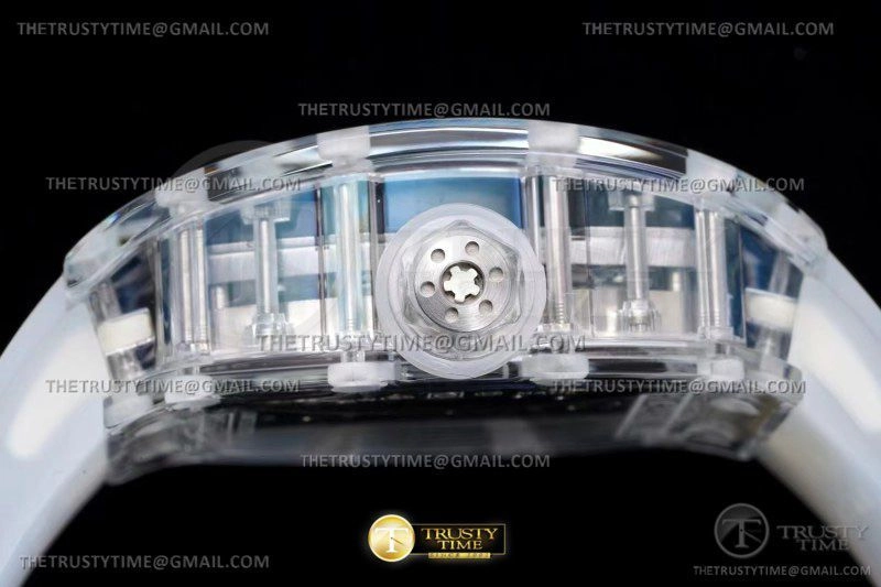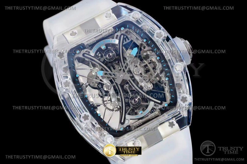 Часы Richard Mille из коллекции RM053. Классические мужские часы Richard Mille RM053-02 Tourbillon Sapphire премиального качества (Артикул магазина: RM-0549) оснащены надежным автоматическим механизмом с ручным заводом калибра Seagull Handwind Tourbillon, в котором реализованы следующие функции: часова и минутка стрелки, а так же турбийон. Бочкообразный корпус часов прозрачного цвета, имеющий размер 43 мм X 49 мм и высоту 16 мм превосходно дополнит образ и украсит запястье своего обладателя. Для изготовления часов Richard Mille RM053-02 Tourbillon Sapphire предлагаемых в нашем интернет-магазине, применяются композитный материал высокого качества (Швейцарский стандарт), а так же сапфировое стекло высокой прочности, благодаря чему обеспечивается максимальная защита от сколов и механических повреждений. Отличительной чертой данной модели является скелетонизированный циферблат, часовые индексы которого обеспечивают часовые метки. Завершает образ каучуковый ремешок белого цвета с фирменной раскладывающейся застежкой Richard Mille. Водонепроницаемость данной модели составляет 30М (WR30) – допускается минимальное воздействие с водой.