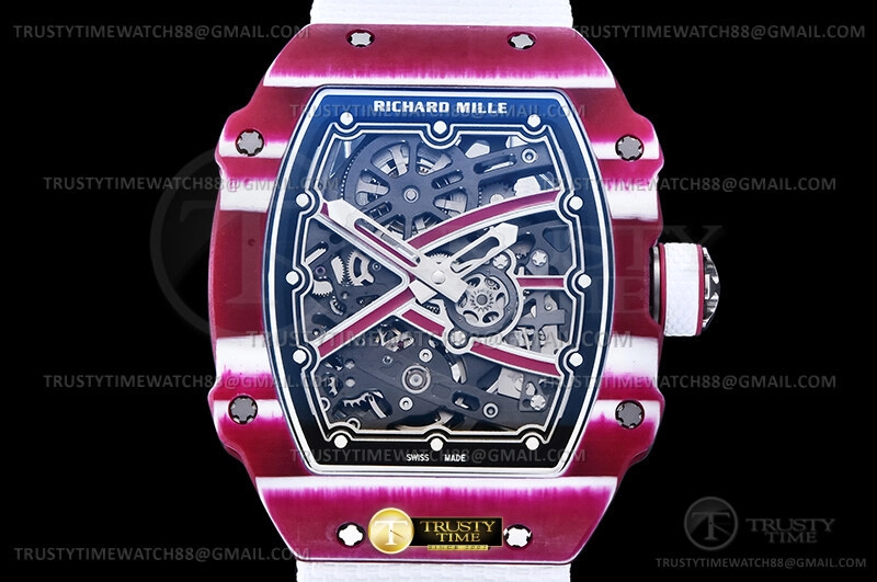 Часы Richard Mille из коллекции RM67-02. Спортивные мужские часы Richard Mille RM67-02 Mutaz Essa премиального качества (Артикул магазина: RM-0609) оснащены надежным автоматическим механизмом с автоподзаводом (работает от амплитуды движения руки) калибра CRMA7, в котором реализованы следующие функции: часова и минутка стрелки, а так же максимально простой функционал без усложнений. Бочкообразный корпус часов красного цвета, имеющий размер 39 мм x 48 мм и высоту 7.8 мм превосходно дополнит образ и украсит запястье своего обладателя. Для изготовления часов Richard Mille RM67-02 Mutaz Essa предлагаемых в нашем интернет-магазине, применяются карбон NTPT высокого качества (Швейцарский стандарт), а так же сапфировое стекло высокой прочности, благодаря чему обеспечивается максимальная защита от сколов и механических повреждений. Отличительной чертой данной модели является скелетонизированный циферблат, часовые индексы которого обеспечивают часовые метки. Завершает образ Эластичный белого цвета без застежки Richard Mille. Водонепроницаемость данной модели составляет 30М (WR30) – допускается минимальное воздействие с водой.