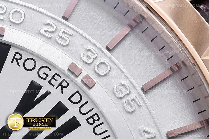 Часы Roger Dubuis из коллекции Excalibur Double Flying Tourbillon. Классические мужские часы Roger Dubuis Excalibur Double Flying Tourbillon 45mm RDDBEX0249 премиального качества (Артикул магазина: RG-0419) оснащены надежным автоматическим механизмом с ручным заводом калибра RD100 Real Double Flying Tourbillon, в котором реализованы следующие функции: часова и минутка стрелки, а так же двойной турбийон. Круглый корпус часов розового цвета, имеющий размер 45 мм и высоту 15 мм превосходно дополнит образ и украсит запястье своего обладателя. Для изготовления часов Roger Dubuis Excalibur Double Flying Tourbillon 45mm RDDBEX0249 предлагаемых в нашем интернет-магазине, применяются нержавеющая сталь 316L высокого качества (Швейцарский стандарт), а так же сапфировое стекло высокой прочности, благодаря чему обеспечивается максимальная защита от сколов и механических повреждений. Отличительной чертой данной модели является серебристый циферблат, часовые индексы которого обеспечивают римские цифры. Завершает образ кожаный ремешок коричневого цвета с фирменной раскладывающейся застежкой Roger Dubuis. Водонепроницаемость данной модели составляет 30М (WR30) – допускается минимальное воздействие с водой.