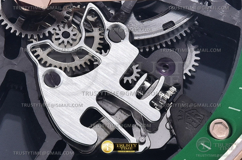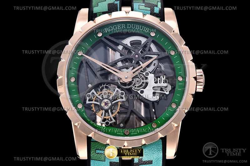 Часы Roger Dubuis из коллекции Excalibur Tourbillon Skeleton. Классические мужские часы Roger Dubuis Excalibur Skeleton Flying Tourbillon премиального качества (Артикул магазина: RG-0448) оснащены надежным автоматическим механизмом с ручным заводом калибра Seagull Handwind Tourbillon, в котором реализованы следующие функции: часова и минутка стрелки, а так же турбийон. Круглый корпус часов розового цвета, имеющий размер 47 мм и высоту 14 мм превосходно дополнит образ и украсит запястье своего обладателя. Для изготовления часов Roger Dubuis Excalibur Skeleton Flying Tourbillon предлагаемых в нашем интернет-магазине, применяются нержавеющая сталь 316L высокого качества (Швейцарский стандарт), а так же сапфировое стекло высокой прочности, благодаря чему обеспечивается максимальная защита от сколов и механических повреждений. Отличительной чертой данной модели является скелетонизированный циферблат, часовые индексы которого обеспечивают часовые метки. Завершает образ кожаный ремешок зеленого цвета с фирменной раскладывающейся застежкой Roger Dubuis. Водонепроницаемость данной модели составляет 30М (WR30) – допускается минимальное воздействие с водой.