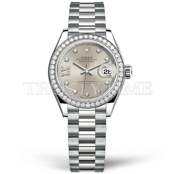 Часы Rolex из коллекции DateJust. Классические женские часы Rolex DateJust 28mm 279139RBR-0003 премиального качества (Артикул магазина: RX-0205) оснащены надежным автоматическим механизмом с автоподзаводом (работает от амплитуды движения руки) калибра ETA2671, в котором реализованы следующие функции: часовая, минутная и секундная стрелки, а так же дата. Круглый корпус часов стального цвета, имеющий размер 28 мм и высоту 11 мм превосходно дополнит образ и украсит запястье своего обладателя. Для изготовления часов Rolex DateJust 28mm 279139RBR-0003 предлагаемых в нашем интернет-магазине, применяются нержавеющая сталь 316F высокого качества (Швейцарский стандарт), а так же сапфировое стекло высокой прочности, благодаря чему обеспечивается максимальная защита от сколов и механических повреждений. Отличительной чертой данной модели является серебристый циферблат, часовые индексы которого обеспечивают камни. Завершает образ браслет из нержавеющей стали стального цвета с фирменной раскладывающейся застежкой Rolex. Водонепроницаемость данной модели составляет 30М (WR30) – допускается минимальное воздействие с водой.