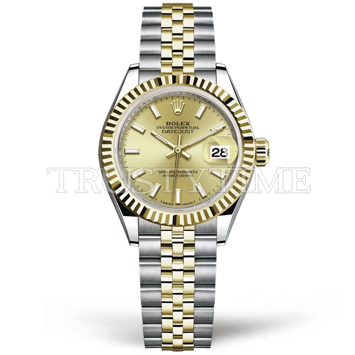 Часы Rolex из коллекции DateJust. Классические женские часы Rolex DateJust 28mm 279173-0001 премиального качества (Артикул магазина: RX-1965) оснащены надежным автоматическим механизмом с автоподзаводом (работает от амплитуды движения руки) калибра ETA2671, в котором реализованы следующие функции: часовая, минутная и секундная стрелки, а так же дата. Круглый корпус часов комбинированного сталь с желтого золота цвета, имеющий размер 28 мм и высоту 11 мм превосходно дополнит образ и украсит запястье своего обладателя. Для изготовления часов Rolex DateJust 28mm 279173-0001 предлагаемых в нашем интернет-магазине, применяются нержавеющая сталь 904L высокого качества (Швейцарский стандарт), а так же сапфировое стекло высокой прочности, благодаря чему обеспечивается максимальная защита от сколов и механических повреждений. Отличительной чертой данной модели является золотой циферблат, часовые индексы которого обеспечивают часовые метки. Завершает образ браслет из нержавеющей стали комбинированного сталь с желтым золотом цвета с фирменной раскладывающейся застежкой Rolex. Водонепроницаемость данной модели составляет 30М (WR30) – допускается минимальное воздействие с водой.