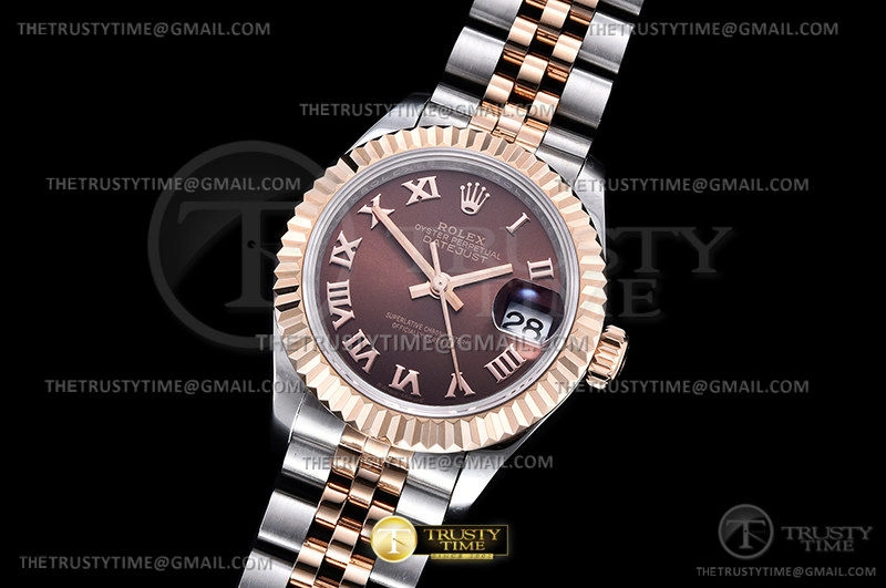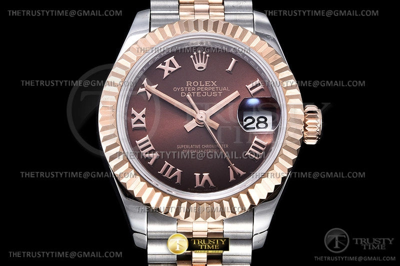Часы Rolex из коллекции DateJust. Классические женские часы Rolex DateJust 28mm 279171-0009 премиального качества (Артикул магазина: RX-1990) оснащены надежным автоматическим механизмом с автоподзаводом (работает от амплитуды движения руки) калибра ETA2671, в котором реализованы следующие функции: часовая, минутная и секундная стрелки, а так же дата. Круглый корпус часов комбинированного сталь с розового золота цвета, имеющий размер 28 мм и высоту 11 мм превосходно дополнит образ и украсит запястье своего обладателя. Для изготовления часов Rolex DateJust 28mm 279171-0009 предлагаемых в нашем интернет-магазине, применяются нержавеющая сталь 904L высокого качества (Швейцарский стандарт), а так же сапфировое стекло высокой прочности, благодаря чему обеспечивается максимальная защита от сколов и механических повреждений. Отличительной чертой данной модели является коричневый циферблат, часовые индексы которого обеспечивают римские цифры. Завершает образ браслет из нержавеющей стали комбинированного сталь с розовым золотом цвета с фирменной раскладывающейся застежкой Rolex. Водонепроницаемость данной модели составляет 30М (WR30) – допускается минимальное воздействие с водой.
