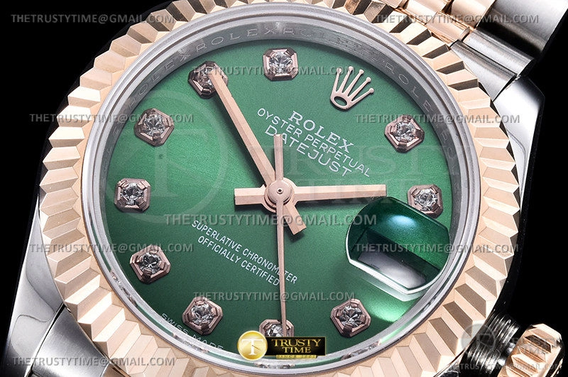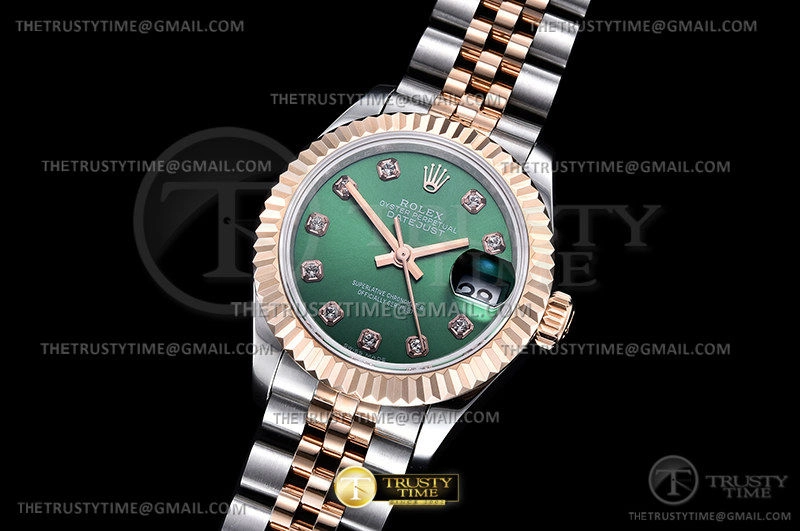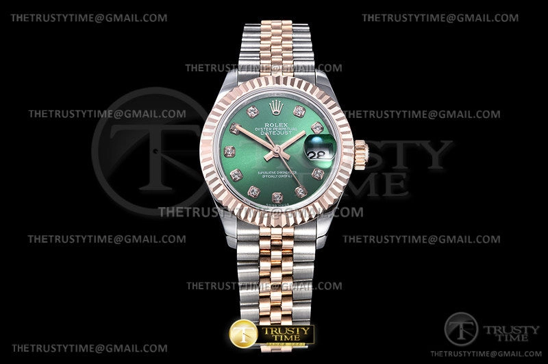 Часы Rolex из коллекции DateJust. Классические женские часы Rolex DateJust 28mm 279171-0007 премиального качества (Артикул магазина: RX-1999) оснащены надежным автоматическим механизмом с автоподзаводом (работает от амплитуды движения руки) калибра ETA2671, в котором реализованы следующие функции: часовая, минутная и секундная стрелки, а так же дата. Круглый корпус часов комбинированного сталь с розового золота цвета, имеющий размер 28 мм и высоту 11 мм превосходно дополнит образ и украсит запястье своего обладателя. Для изготовления часов Rolex DateJust 28mm 279171-0007 предлагаемых в нашем интернет-магазине, применяются нержавеющая сталь 904L высокого качества (Швейцарский стандарт), а так же сапфировое стекло высокой прочности, благодаря чему обеспечивается максимальная защита от сколов и механических повреждений. Отличительной чертой данной модели является зеленый циферблат, часовые индексы которого обеспечивают камни. Завершает образ браслет из нержавеющей стали комбинированного сталь с розовым золотом цвета с фирменной раскладывающейся застежкой Rolex. Водонепроницаемость данной модели составляет 30М (WR30) – допускается минимальное воздействие с водой.