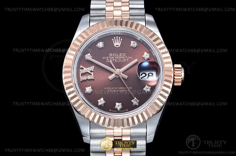 Часы Rolex из коллекции DateJust. Классические женские часы Rolex DateJust 28mm 279171-0003 премиального качества (Артикул магазина: RX-2883) оснащены надежным автоматическим механизмом с автоподзаводом (работает от амплитуды движения руки) калибра ETA2671, в котором реализованы следующие функции: часовая, минутная и секундная стрелки, а так же дата. Круглый корпус часов комбинированного сталь с розового золота цвета, имеющий размер 28 мм и высоту 11 мм превосходно дополнит образ и украсит запястье своего обладателя. Для изготовления часов Rolex DateJust 28mm 279171-0003 предлагаемых в нашем интернет-магазине, применяются нержавеющая сталь 904L высокого качества (Швейцарский стандарт), а так же сапфировое стекло высокой прочности, благодаря чему обеспечивается максимальная защита от сколов и механических повреждений. Отличительной чертой данной модели является коричневый циферблат, часовые индексы которого обеспечивают камни. Завершает образ браслет из нержавеющей стали комбинированного сталь с розовым золотом цвета с фирменной раскладывающейся застежкой Rolex. Водонепроницаемость данной модели составляет 30М (WR30) – допускается минимальное воздействие с водой.
