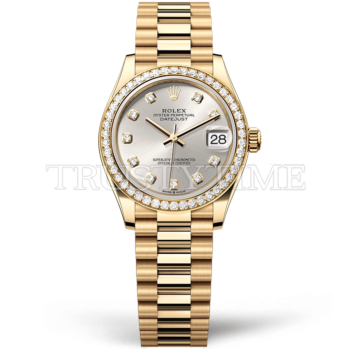 Часы Rolex из коллекции DateJust. Классические женские часы Rolex DateJust 31mm 278288RBR-0028 премиального качества (Артикул магазина: RX-0555) оснащены надежным автоматическим механизмом с автоподзаводом (работает от амплитуды движения руки) калибра ETA2824-2, в котором реализованы следующие функции: часовая, минутная и секундная стрелки, а так же дата. Круглый корпус часов цветы желтой золота, имеющий размер 31 мм и высоту 12 мм превосходно дополнит образ и украсит запястье своего обладателя. Для изготовления часов Rolex DateJust 31mm 278288RBR-0028 предлагаемых в нашем интернет-магазине, применяются нержавеющая сталь 316F высокого качества (Швейцарский стандарт), а так же сапфировое стекло высокой прочности, благодаря чему обеспечивается максимальная защита от сколов и механических повреждений. Отличительной чертой данной модели является серебристый циферблат, часовые индексы которого обеспечивают камни. Завершает образ браслет из нержавеющей стали цвета желтого золота с фирменной раскладывающейся застежкой Rolex. Водонепроницаемость данной модели составляет 30М (WR30) – допускается минимальное воздействие с водой.