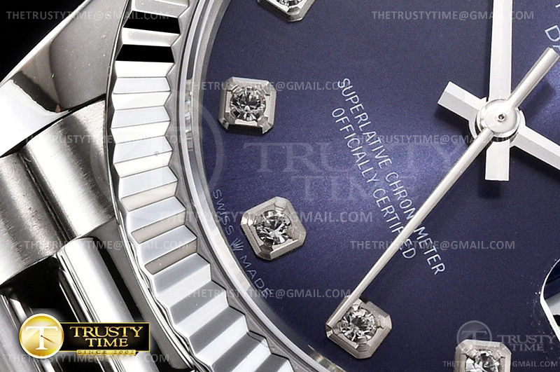 Часы Rolex из коллекции DateJust. Классические женские часы Rolex DateJust 31mm 178279-0033 премиального качества (Артикул магазина: RX-0537) оснащены надежным автоматическим механизмом с автоподзаводом (работает от амплитуды движения руки) калибра ETA2824-2, в котором реализованы следующие функции: часовая, минутная и секундная стрелки, а так же дата. Круглый корпус часов стального цвета, имеющий размер 31 мм и высоту 12 мм превосходно дополнит образ и украсит запястье своего обладателя. Для изготовления часов Rolex DateJust 31mm 178279-0033 предлагаемых в нашем интернет-магазине, применяются нержавеющая сталь 316F высокого качества (Швейцарский стандарт), а так же сапфировое стекло высокой прочности, благодаря чему обеспечивается максимальная защита от сколов и механических повреждений. Отличительной чертой данной модели является синий циферблат, часовые индексы которого обеспечивают камни. Завершает образ браслет из нержавеющей стали стального цвета с фирменной раскладывающейся застежкой Rolex. Водонепроницаемость данной модели составляет 30М (WR30) – допускается минимальное воздействие с водой.