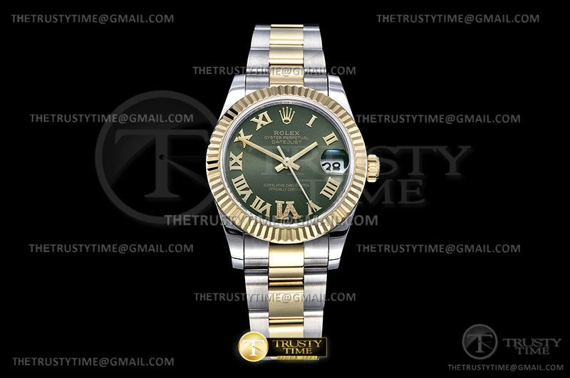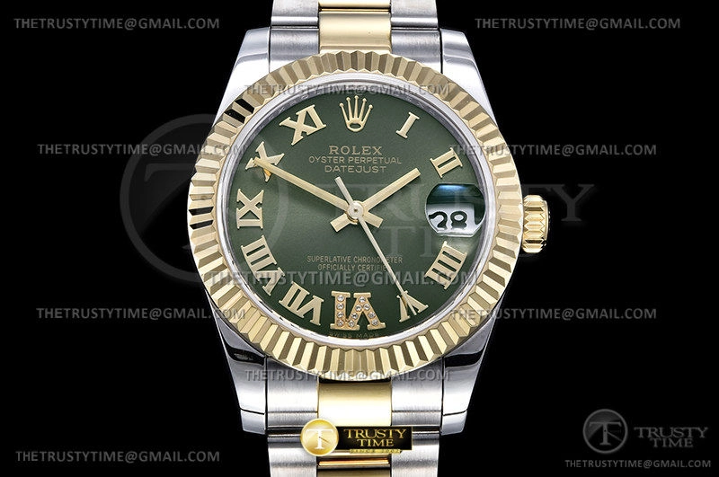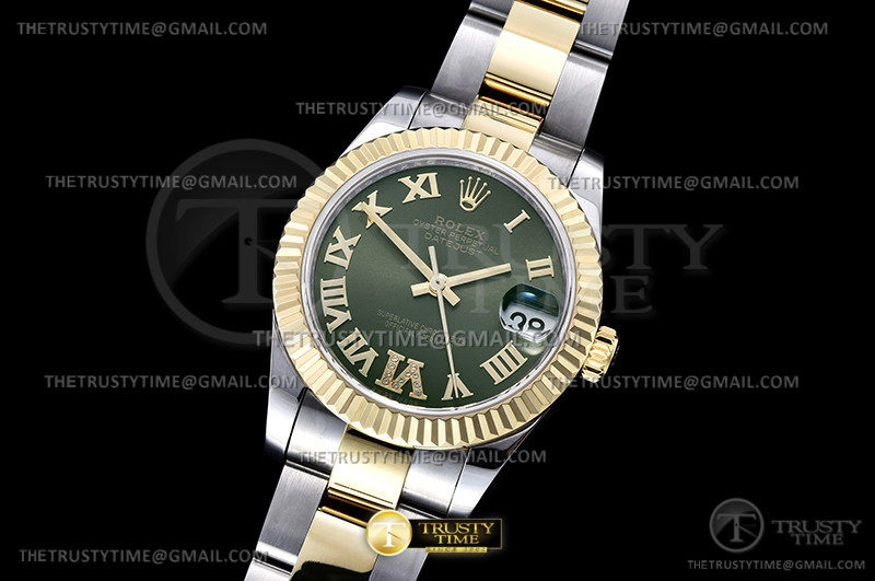 Часы Rolex из коллекции DateJust. Классические женские часы Rolex DateJust 31mm 278273-0015 премиального качества (Артикул магазина: RX-1894) оснащены надежным автоматическим механизмом с автоподзаводом (работает от амплитуды движения руки) калибра ETA2824-2, в котором реализованы следующие функции: часовая, минутная и секундная стрелки, а так же дата. Круглый корпус часов комбинированного сталь с желтого золота цвета, имеющий размер 31 мм и высоту 12 мм превосходно дополнит образ и украсит запястье своего обладателя. Для изготовления часов Rolex DateJust 31mm 278273-0015 предлагаемых в нашем интернет-магазине, применяются нержавеющая сталь 316F высокого качества (Швейцарский стандарт), а так же сапфировое стекло высокой прочности, благодаря чему обеспечивается максимальная защита от сколов и механических повреждений. Отличительной чертой данной модели является зеленый циферблат, часовые индексы которого обеспечивают римские цифры. Завершает образ браслет из нержавеющей стали комбинированного сталь с желтым золотом цвета с фирменной раскладывающейся застежкой Rolex. Водонепроницаемость данной модели составляет 30М (WR30) – допускается минимальное воздействие с водой.