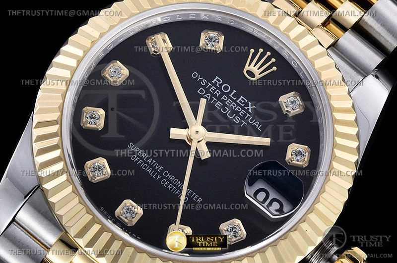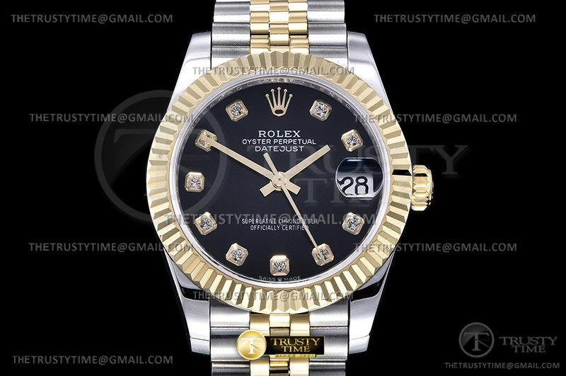 Часы Rolex из коллекции DateJust. Классические женские часы Rolex DateJust 31mm 178273-0020 премиального качества (Артикул магазина: RX-2064) оснащены надежным автоматическим механизмом с автоподзаводом (работает от амплитуды движения руки) калибра ETA2836-2, в котором реализованы следующие функции: часовая, минутная и секундная стрелки, а так же дата. Круглый корпус часов комбинированного сталь с желтого золота цвета, имеющий размер 31 мм и высоту 12 мм превосходно дополнит образ и украсит запястье своего обладателя. Для изготовления часов Rolex DateJust 31mm 178273-0020 предлагаемых в нашем интернет-магазине, применяются нержавеющая сталь 316F высокого качества (Швейцарский стандарт), а так же сапфировое стекло высокой прочности, благодаря чему обеспечивается максимальная защита от сколов и механических повреждений. Отличительной чертой данной модели является черный циферблат, часовые индексы которого обеспечивают камни. Завершает образ браслет из нержавеющей стали комбинированного сталь с желтым золотом цвета с фирменной раскладывающейся застежкой Rolex. Водонепроницаемость данной модели составляет 30М (WR30) – допускается минимальное воздействие с водой.