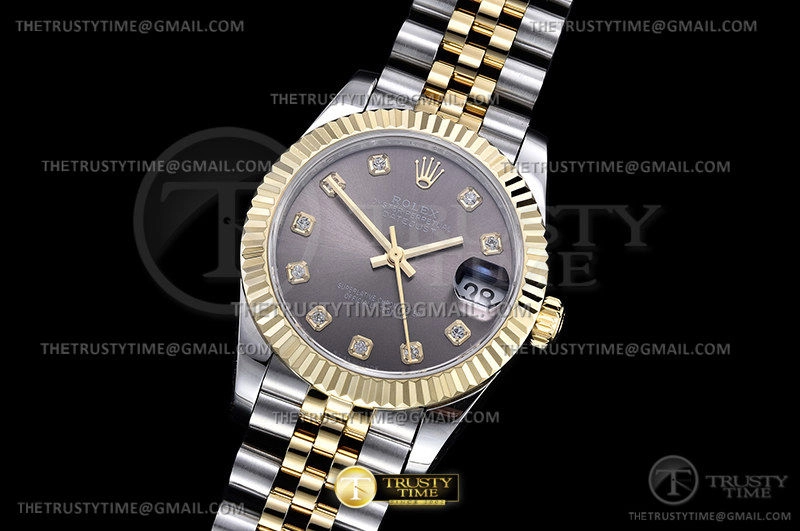 Часы Rolex из коллекции DateJust. Классические женские часы Rolex DateJust 31mm 278273-0022 премиального качества (Артикул магазина: RX-2066) оснащены надежным автоматическим механизмом с автоподзаводом (работает от амплитуды движения руки) калибра ETA2836-2, в котором реализованы следующие функции: часовая, минутная и секундная стрелки, а так же дата. Круглый корпус часов комбинированного сталь с желтого золота цвета, имеющий размер 31 мм и высоту 12 мм превосходно дополнит образ и украсит запястье своего обладателя. Для изготовления часов Rolex DateJust 31mm 278273-0022 предлагаемых в нашем интернет-магазине, применяются нержавеющая сталь 316F высокого качества (Швейцарский стандарт), а так же сапфировое стекло высокой прочности, благодаря чему обеспечивается максимальная защита от сколов и механических повреждений. Отличительной чертой данной модели является серый циферблат, часовые индексы которого обеспечивают камни. Завершает образ браслет из нержавеющей стали комбинированного сталь с желтым золотом цвета с фирменной раскладывающейся застежкой Rolex. Водонепроницаемость данной модели составляет 30М (WR30) – допускается минимальное воздействие с водой.