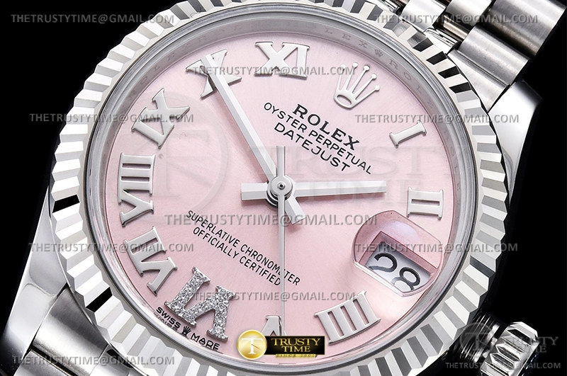 Часы Rolex из коллекции DateJust. Классические женские часы Rolex DateJust 31mm 278274-0024 премиального качества (Артикул магазина: RX-2107) оснащены надежным автоматическим механизмом с автоподзаводом (работает от амплитуды движения руки) калибра ETA2688, в котором реализованы следующие функции: часовая, минутная и секундная стрелки, а так же дата. Круглый корпус часов стального цвета, имеющий размер 31 мм и высоту 12 мм превосходно дополнит образ и украсит запястье своего обладателя. Для изготовления часов Rolex DateJust 31mm 278274-0024 предлагаемых в нашем интернет-магазине, применяются нержавеющая сталь 904L высокого качества (Швейцарский стандарт), а так же сапфировое стекло высокой прочности, благодаря чему обеспечивается максимальная защита от сколов и механических повреждений. Отличительной чертой данной модели является розовый циферблат, часовые индексы которого обеспечивают римские цифры. Завершает образ браслет из нержавеющей стали стального цвета с фирменной раскладывающейся застежкой Rolex. Водонепроницаемость данной модели составляет 30М (WR30) – допускается минимальное воздействие с водой.