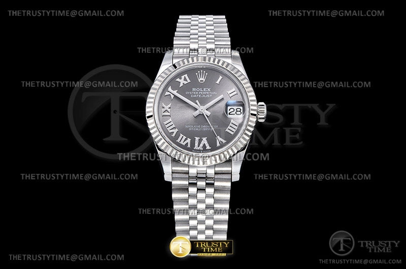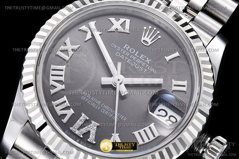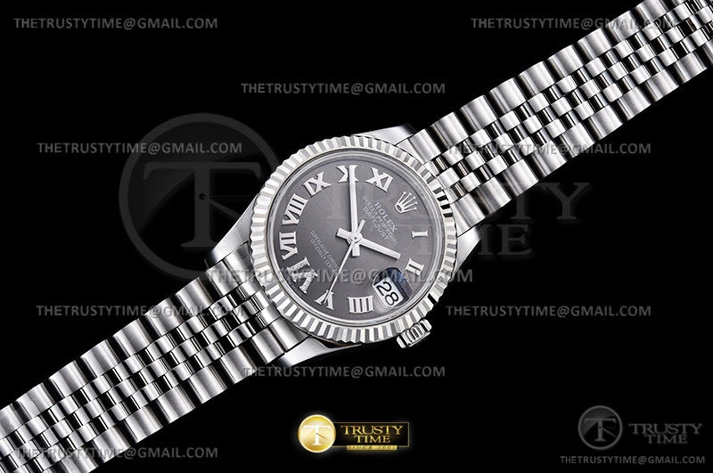 Часы Rolex из коллекции DateJust. Классические женские часы Rolex DateJust 31mm 278274-0028 премиального качества (Артикул магазина: RX-2108) оснащены надежным автоматическим механизмом с автоподзаводом (работает от амплитуды движения руки) калибра ETA2688, в котором реализованы следующие функции: часовая, минутная и секундная стрелки, а так же дата. Круглый корпус часов стального цвета, имеющий размер 31 мм и высоту 12 мм превосходно дополнит образ и украсит запястье своего обладателя. Для изготовления часов Rolex DateJust 31mm 278274-0028 предлагаемых в нашем интернет-магазине, применяются нержавеющая сталь 904L высокого качества (Швейцарский стандарт), а так же сапфировое стекло высокой прочности, благодаря чему обеспечивается максимальная защита от сколов и механических повреждений. Отличительной чертой данной модели является серый циферблат, часовые индексы которого обеспечивают римские цифры. Завершает образ браслет из нержавеющей стали стального цвета с фирменной раскладывающейся застежкой Rolex. Водонепроницаемость данной модели составляет 30М (WR30) – допускается минимальное воздействие с водой.