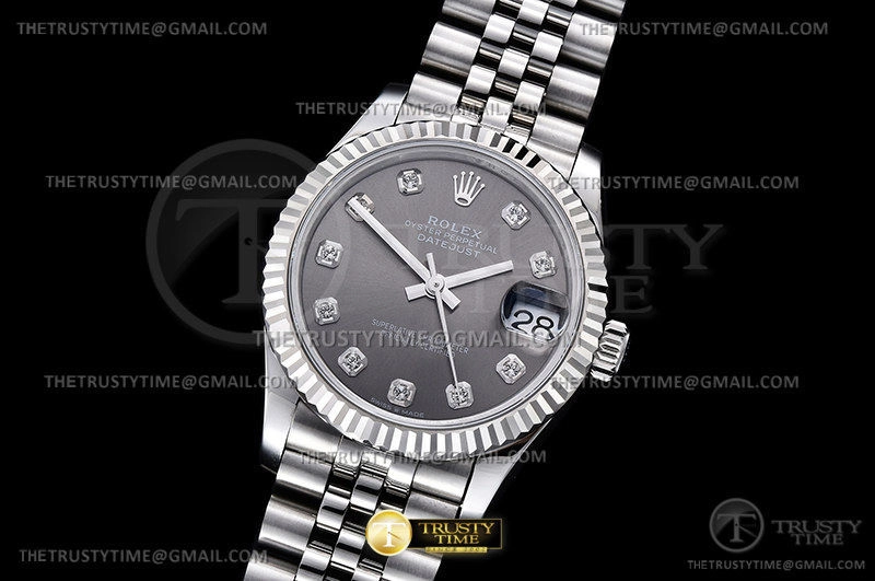 Часы Rolex из коллекции DateJust. Классические женские часы Rolex DateJust 31mm 278274-0008 премиального качества (Артикул магазина: RX-2115) оснащены надежным автоматическим механизмом с автоподзаводом (работает от амплитуды движения руки) калибра ETA2688, в котором реализованы следующие функции: часовая, минутная и секундная стрелки, а так же дата. Круглый корпус часов стального цвета, имеющий размер 31 мм и высоту 12 мм превосходно дополнит образ и украсит запястье своего обладателя. Для изготовления часов Rolex DateJust 31mm 278274-0008 предлагаемых в нашем интернет-магазине, применяются нержавеющая сталь 904L высокого качества (Швейцарский стандарт), а так же сапфировое стекло высокой прочности, благодаря чему обеспечивается максимальная защита от сколов и механических повреждений. Отличительной чертой данной модели является серый циферблат, часовые индексы которого обеспечивают камни. Завершает образ браслет из нержавеющей стали стального цвета с фирменной раскладывающейся застежкой Rolex. Водонепроницаемость данной модели составляет 30М (WR30) – допускается минимальное воздействие с водой.