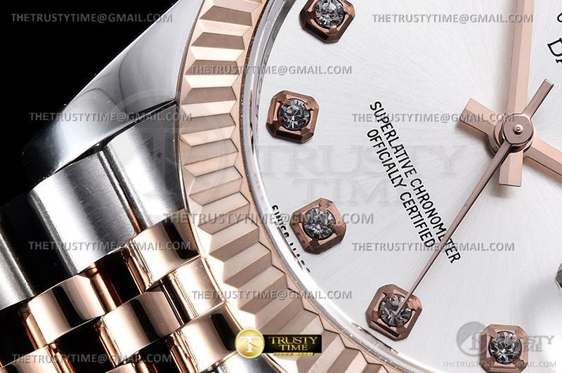 Часы Rolex из коллекции DateJust. Классические женские часы Rolex DateJust 31mm 278271-0016 премиального качества (Артикул магазина: RX-2286) оснащены надежным автоматическим механизмом с автоподзаводом (работает от амплитуды движения руки) калибра ETA2824-2, в котором реализованы следующие функции: часовая, минутная и секундная стрелки, а так же дата. Круглый корпус часов комбинированного сталь с розового золота цвета, имеющий размер 31 мм и высоту 12 мм превосходно дополнит образ и украсит запястье своего обладателя. Для изготовления часов Rolex DateJust 31mm 278271-0016 предлагаемых в нашем интернет-магазине, применяются нержавеющая сталь 904L высокого качества (Швейцарский стандарт), а так же сапфировое стекло высокой прочности, благодаря чему обеспечивается максимальная защита от сколов и механических повреждений. Отличительной чертой данной модели является серебристый циферблат, часовые индексы которого обеспечивают камни. Завершает образ браслет из нержавеющей стали комбинированного сталь с розовым золотом цвета с фирменной раскладывающейся застежкой Rolex. Водонепроницаемость данной модели составляет 30М (WR30) – допускается минимальное воздействие с водой.