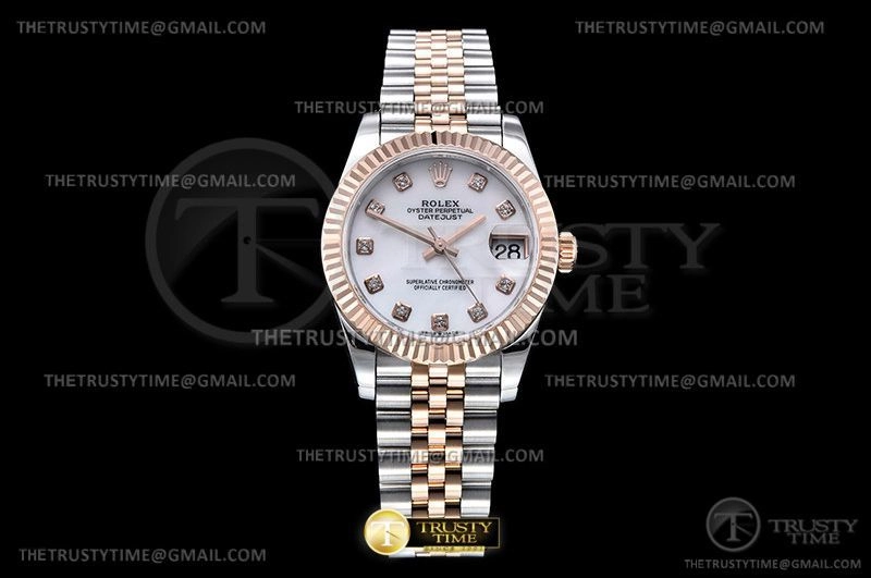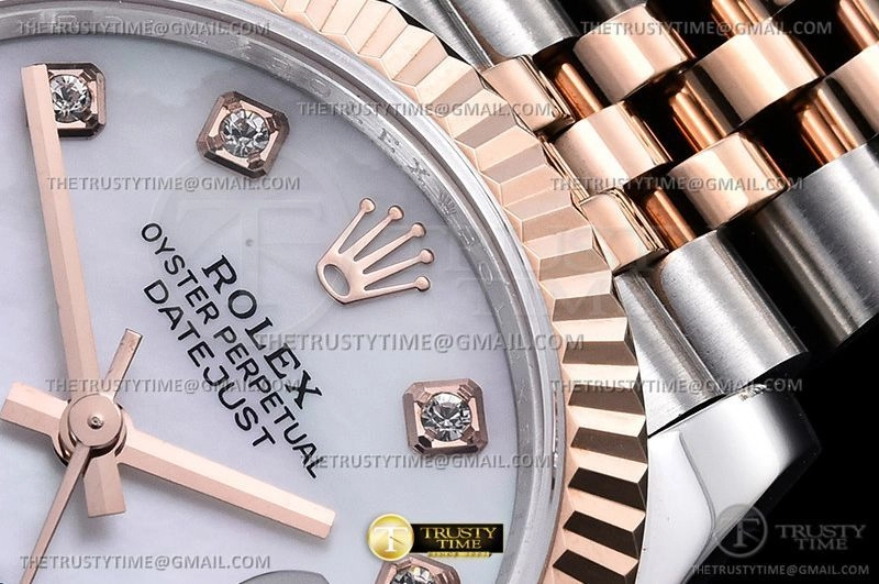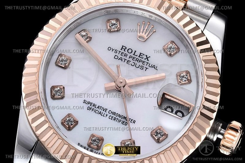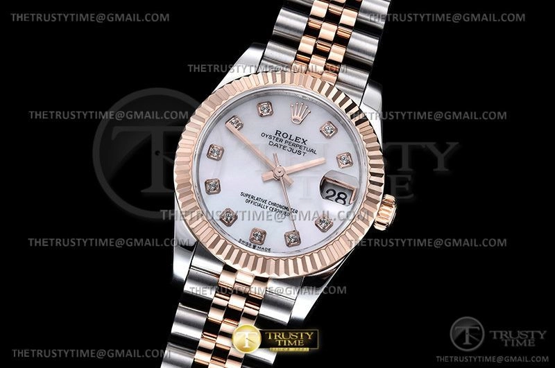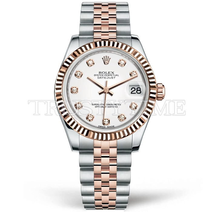 Часы Rolex из коллекции DateJust. Классические женские часы Rolex DateJust 31mm 178271-0010 премиального качества (Артикул магазина: RX-2290) оснащены надежным автоматическим механизмом с автоподзаводом (работает от амплитуды движения руки) калибра ETA2824-2, в котором реализованы следующие функции: часовая, минутная и секундная стрелки, а так же дата. Круглый корпус часов комбинированного сталь с розового золота цвета, имеющий размер 31 мм и высоту 12 мм превосходно дополнит образ и украсит запястье своего обладателя. Для изготовления часов Rolex DateJust 31mm 178271-0010 предлагаемых в нашем интернет-магазине, применяются нержавеющая сталь 904L высокого качества (Швейцарский стандарт), а так же сапфировое стекло высокой прочности, благодаря чему обеспечивается максимальная защита от сколов и механических повреждений. Отличительной чертой данной модели является белый циферблат, часовые индексы которого обеспечивают камни. Завершает образ браслет из нержавеющей стали комбинированного сталь с розовым золотом цвета с фирменной раскладывающейся застежкой Rolex. Водонепроницаемость данной модели составляет 30М (WR30) – допускается минимальное воздействие с водой.