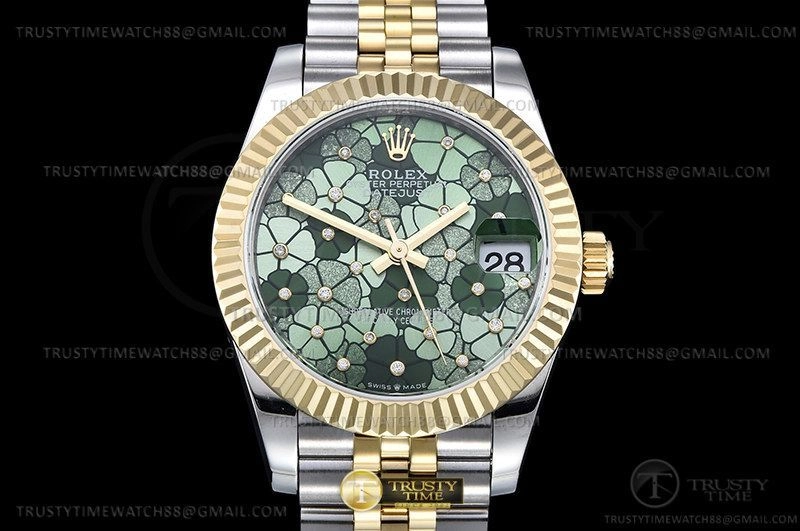 Часы Rolex из коллекции DateJust. Классические женские часы Rolex DateJust 31mm 278273-0032 премиального качества (Артикул магазина: RX-2860) оснащены надежным автоматическим механизмом с автоподзаводом (работает от амплитуды движения руки) калибра ETA2824-2, в котором реализованы следующие функции: часовая, минутная и секундная стрелки, а так же дата. Круглый корпус часов комбинированного сталь с желтого золота цвета, имеющий размер 31 мм и высоту 12 мм превосходно дополнит образ и украсит запястье своего обладателя. Для изготовления часов Rolex DateJust 31mm 278273-0032 предлагаемых в нашем интернет-магазине, применяются нержавеющая сталь 316F высокого качества (Швейцарский стандарт), а так же сапфировое стекло высокой прочности, благодаря чему обеспечивается максимальная защита от сколов и механических повреждений. Отличительной чертой данной модели является зеленый циферблат, без меток и цифр. Завершает образ браслет из нержавеющей стали комбинированного сталь с желтым золотом цвета с фирменной раскладывающейся застежкой Rolex. Водонепроницаемость данной модели составляет 30М (WR30) – допускается минимальное воздействие с водой.