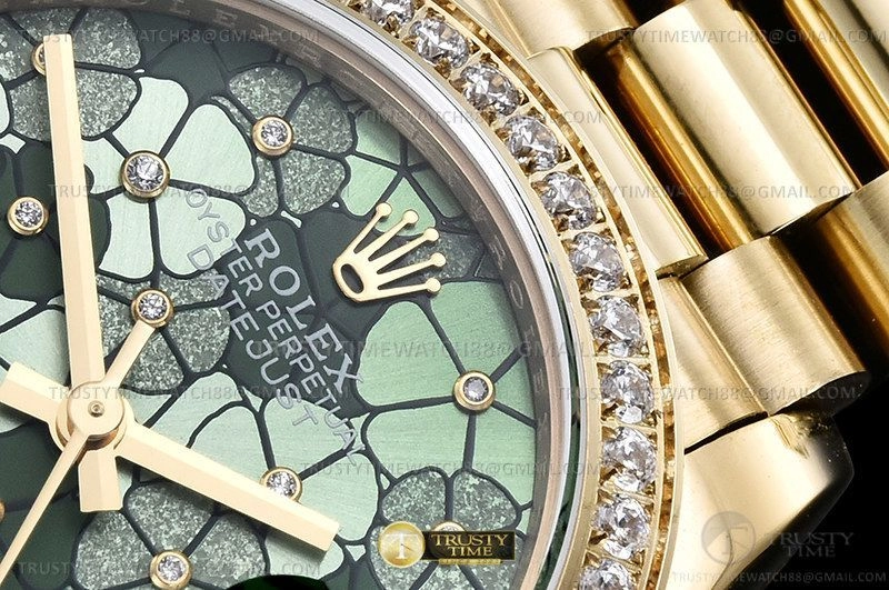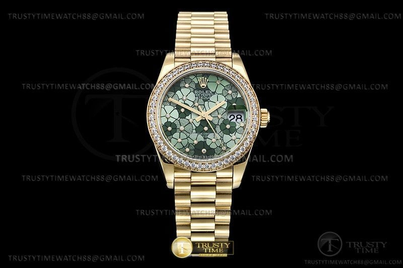 Часы Rolex из коллекции DateJust. Классические женские часы Rolex DateJust 31mm 278288RBR-0038 премиального качества (Артикул магазина: RX-2865) оснащены надежным автоматическим механизмом с автоподзаводом (работает от амплитуды движения руки) калибра ETA2824-2, в котором реализованы следующие функции: часовая, минутная и секундная стрелки, а так же дата. Круглый корпус часов цветы желтой золота, имеющий размер 31 мм и высоту 12 мм превосходно дополнит образ и украсит запястье своего обладателя. Для изготовления часов Rolex DateJust 31mm 278288RBR-0038 предлагаемых в нашем интернет-магазине, применяются нержавеющая сталь 316F высокого качества (Швейцарский стандарт), а так же сапфировое стекло высокой прочности, благодаря чему обеспечивается максимальная защита от сколов и механических повреждений. Отличительной чертой данной модели является зеленый циферблат, без меток и цифр. Завершает образ браслет из нержавеющей стали цвета желтого золота с фирменной раскладывающейся застежкой Rolex. Водонепроницаемость данной модели составляет 30М (WR30) – допускается минимальное воздействие с водой.