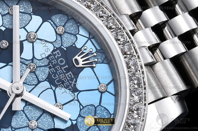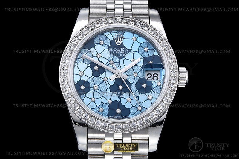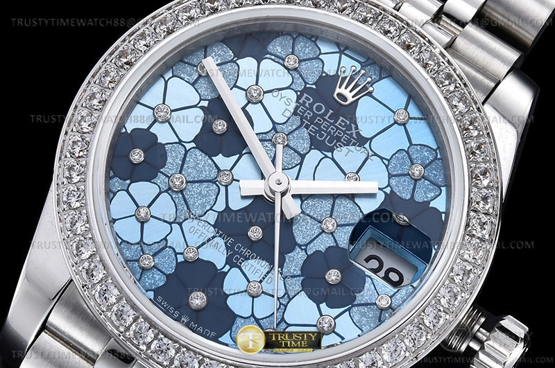 Часы Rolex из коллекции DateJust. Классические женские часы Rolex DateJust 31mm 278384RBR-0040 премиального качества (Артикул магазина: RX-2876) оснащены надежным автоматическим механизмом с автоподзаводом (работает от амплитуды движения руки) калибра ETA2824-2, в котором реализованы следующие функции: часовая, минутная и секундная стрелки, а так же дата. Круглый корпус часов стального цвета, имеющий размер 31 мм и высоту 12 мм превосходно дополнит образ и украсит запястье своего обладателя. Для изготовления часов Rolex DateJust 31mm 278384RBR-0040 предлагаемых в нашем интернет-магазине, применяются нержавеющая сталь 316F высокого качества (Швейцарский стандарт), а так же сапфировое стекло высокой прочности, благодаря чему обеспечивается максимальная защита от сколов и механических повреждений. Отличительной чертой данной модели является синий циферблат, без меток и цифр. Завершает образ браслет из нержавеющей стали стального цвета с фирменной раскладывающейся застежкой Rolex. Водонепроницаемость данной модели составляет 30М (WR30) – допускается минимальное воздействие с водой.