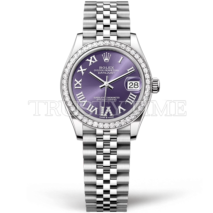 Часы Rolex из коллекции DateJust. Классические женские часы Rolex DateJust 31mm 278384RBR-0030 премиального качества (Артикул магазина: RX-3006) оснащены надежным автоматическим механизмом с автоподзаводом (работает от амплитуды движения руки) калибра ETA2836-2, в котором реализованы следующие функции: часовая, минутная и секундная стрелки, а так же дата. Круглый корпус часов стального цвета, имеющий размер 31 мм и высоту 12 мм превосходно дополнит образ и украсит запястье своего обладателя. Для изготовления часов Rolex DateJust 31mm 278384RBR-0030 предлагаемых в нашем интернет-магазине, применяются нержавеющая сталь 316F высокого качества (Швейцарский стандарт), а так же сапфировое стекло высокой прочности, благодаря чему обеспечивается максимальная защита от сколов и механических повреждений. Отличительной чертой данной модели является фиолетовый циферблат, часовые индексы которого обеспечивают римские цифры. Завершает образ браслет из нержавеющей стали стального цвета с фирменной раскладывающейся застежкой Rolex. Водонепроницаемость данной модели составляет 30М (WR30) – допускается минимальное воздействие с водой.