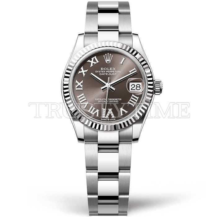 Часы Rolex из коллекции DateJust. Классические женские часы Rolex DateJust 31mm 278274-0027 премиального качества (Артикул магазина: RX-3024) оснащены надежным автоматическим механизмом с автоподзаводом (работает от амплитуды движения руки) калибра ETA2836-2, в котором реализованы следующие функции: часовая, минутная и секундная стрелки, а так же дата. Круглый корпус часов стального цвета, имеющий размер 31 мм и высоту 12 мм превосходно дополнит образ и украсит запястье своего обладателя. Для изготовления часов Rolex DateJust 31mm 278274-0027 предлагаемых в нашем интернет-магазине, применяются нержавеющая сталь 316F высокого качества (Швейцарский стандарт), а так же сапфировое стекло высокой прочности, благодаря чему обеспечивается максимальная защита от сколов и механических повреждений. Отличительной чертой данной модели является серый циферблат, часовые индексы которого обеспечивают римские цифры. Завершает образ браслет из нержавеющей стали стального цвета с фирменной раскладывающейся застежкой Rolex. Водонепроницаемость данной модели составляет 30М (WR30) – допускается минимальное воздействие с водой.