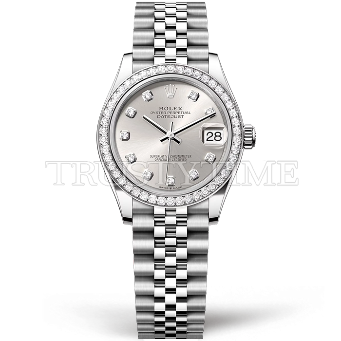 Часы Rolex из коллекции DateJust. Классические женские часы Rolex DateJust 31mm 278384RBR-0034 премиального качества (Артикул магазина: RX-3096) оснащены надежным автоматическим механизмом с автоподзаводом (работает от амплитуды движения руки) калибра ETA2688, в котором реализованы следующие функции: часовая, минутная и секундная стрелки, а так же дата. Круглый корпус часов стального цвета, имеющий размер 31 мм и высоту 12 мм превосходно дополнит образ и украсит запястье своего обладателя. Для изготовления часов Rolex DateJust 31mm 278384RBR-0034 предлагаемых в нашем интернет-магазине, применяются нержавеющая сталь 904L высокого качества (Швейцарский стандарт), а так же сапфировое стекло высокой прочности, благодаря чему обеспечивается максимальная защита от сколов и механических повреждений. Отличительной чертой данной модели является серебристый циферблат, часовые индексы которого обеспечивают камни. Завершает образ браслет из нержавеющей стали стального цвета с фирменной раскладывающейся застежкой Rolex. Водонепроницаемость данной модели составляет 30М (WR30) – допускается минимальное воздействие с водой.