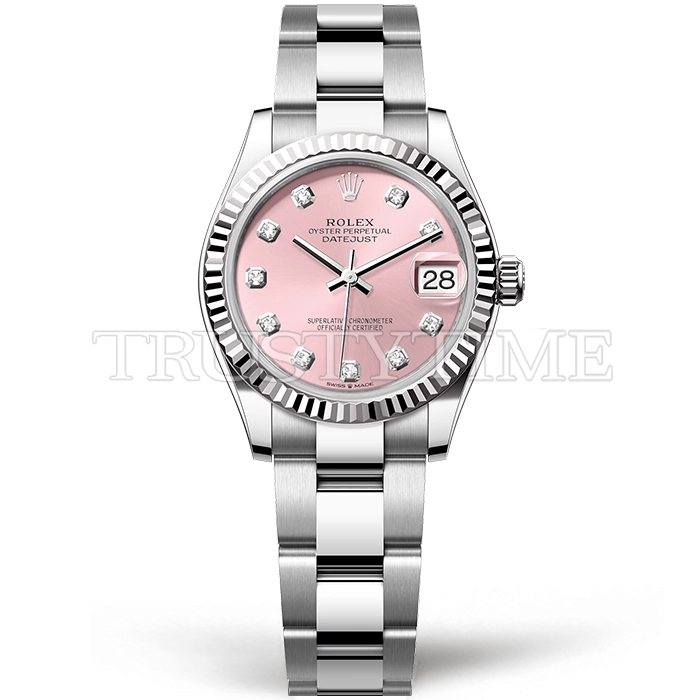 Часы Rolex из коллекции DateJust. Классические женские часы Rolex DateJust 31mm 278274-0031 премиального качества (Артикул магазина: RX-3098) оснащены надежным автоматическим механизмом с автоподзаводом (работает от амплитуды движения руки) калибра ETA2688, в котором реализованы следующие функции: часовая, минутная и секундная стрелки, а так же дата. Круглый корпус часов стального цвета, имеющий размер 31 мм и высоту 12 мм превосходно дополнит образ и украсит запястье своего обладателя. Для изготовления часов Rolex DateJust 31mm 278274-0031 предлагаемых в нашем интернет-магазине, применяются нержавеющая сталь 904L высокого качества (Швейцарский стандарт), а так же сапфировое стекло высокой прочности, благодаря чему обеспечивается максимальная защита от сколов и механических повреждений. Отличительной чертой данной модели является розовый циферблат, часовые индексы которого обеспечивают камни. Завершает образ браслет из нержавеющей стали стального цвета с фирменной раскладывающейся застежкой Rolex. Водонепроницаемость данной модели составляет 30М (WR30) – допускается минимальное воздействие с водой.
