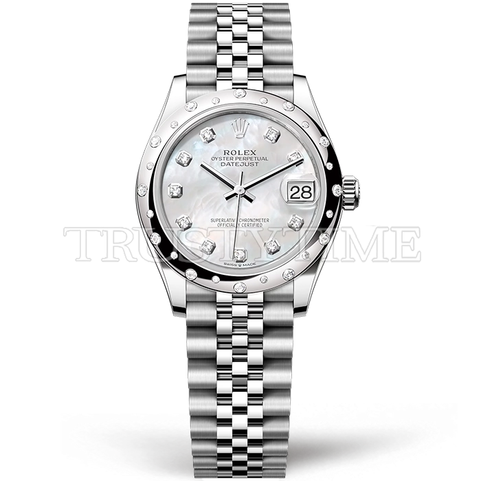 Часы Rolex из коллекции DateJust. Классические женские часы Rolex DateJust 31mm 278344RBR-0006 премиального качества (Артикул магазина: RX-3106) оснащены надежным автоматическим механизмом с автоподзаводом (работает от амплитуды движения руки) калибра ETA2836-2, в котором реализованы следующие функции: часовая, минутная и секундная стрелки, а так же дата. Круглый корпус часов стального цвета, имеющий размер 31 мм и высоту 11 мм превосходно дополнит образ и украсит запястье своего обладателя. Для изготовления часов Rolex DateJust 31mm 278344RBR-0006 предлагаемых в нашем интернет-магазине, применяются нержавеющая сталь 316L высокого качества (Швейцарский стандарт), а так же сапфировое стекло высокой прочности, благодаря чему обеспечивается максимальная защита от сколов и механических повреждений. Отличительной чертой данной модели является перламутровый циферблат, часовые индексы которого обеспечивают камни. Завершает образ браслет из нержавеющей стали стального цвета с фирменной раскладывающейся застежкой Rolex. Водонепроницаемость данной модели составляет 30М (WR30) – допускается минимальное воздействие с водой.