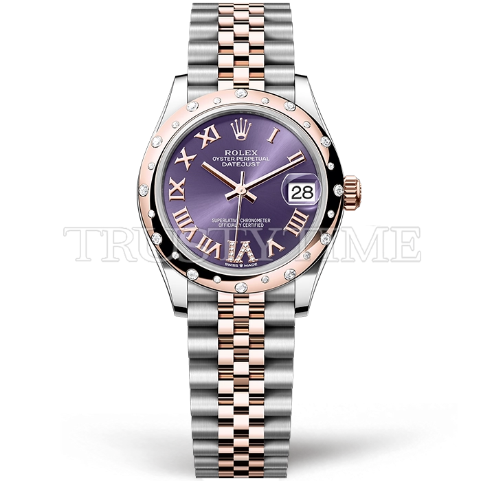 Часы Rolex из коллекции DateJust. Классические женские часы Rolex DateJust 31mm 278341RBR-0020 премиального качества (Артикул магазина: RX-3111) оснащены надежным автоматическим механизмом с автоподзаводом (работает от амплитуды движения руки) калибра ETA2836-2, в котором реализованы следующие функции: часовая, минутная и секундная стрелки, а так же дата. Круглый корпус часов комбинированного сталь с розового золота цвета, имеющий размер 31 мм и высоту 12 мм превосходно дополнит образ и украсит запястье своего обладателя. Для изготовления часов Rolex DateJust 31mm 278341RBR-0020 предлагаемых в нашем интернет-магазине, применяются нержавеющая сталь 316F высокого качества (Швейцарский стандарт), а так же сапфировое стекло высокой прочности, благодаря чему обеспечивается максимальная защита от сколов и механических повреждений. Отличительной чертой данной модели является фиолетовый циферблат, часовые индексы которого обеспечивают римские цифры. Завершает образ браслет из нержавеющей стали комбинированного сталь с розовым золотом цвета с фирменной раскладывающейся застежкой Rolex. Водонепроницаемость данной модели составляет 30М (WR30) – допускается минимальное воздействие с водой.