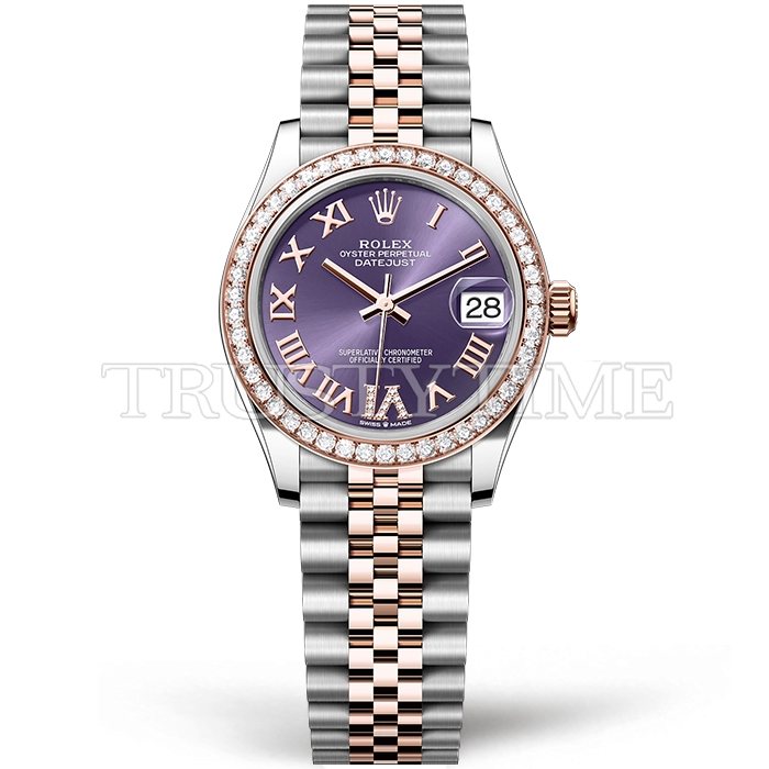 Часы Rolex из коллекции DateJust. Классические женские часы Rolex DateJust 31mm 278381RBR-0020 премиального качества (Артикул магазина: RX-3113) оснащены надежным автоматическим механизмом с автоподзаводом (работает от амплитуды движения руки) калибра ETA2836-2, в котором реализованы следующие функции: часовая, минутная и секундная стрелки, а так же дата. Круглый корпус часов комбинированного сталь с розового золота цвета, имеющий размер 31 мм и высоту 12 мм превосходно дополнит образ и украсит запястье своего обладателя. Для изготовления часов Rolex DateJust 31mm 278381RBR-0020 предлагаемых в нашем интернет-магазине, применяются нержавеющая сталь 316F высокого качества (Швейцарский стандарт), а так же сапфировое стекло высокой прочности, благодаря чему обеспечивается максимальная защита от сколов и механических повреждений. Отличительной чертой данной модели является фиолетовый циферблат, часовые индексы которого обеспечивают римские цифры. Завершает образ браслет из нержавеющей стали комбинированного сталь с розовым золотом цвета с фирменной раскладывающейся застежкой Rolex. Водонепроницаемость данной модели составляет 30М (WR30) – допускается минимальное воздействие с водой.