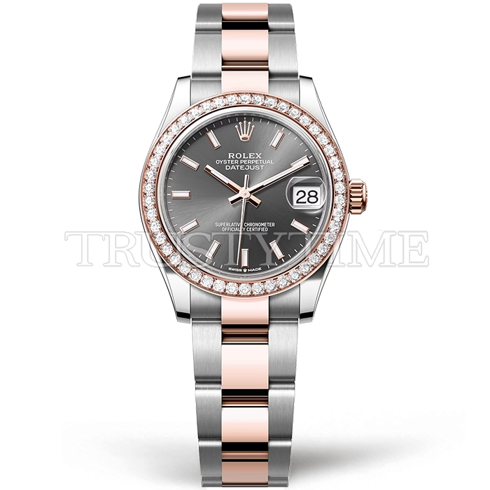 Часы Rolex из коллекции DateJust. Классические женские часы Rolex DateJust 31mm 278381RBR-0017 премиального качества (Артикул магазина: RX-3150) оснащены надежным автоматическим механизмом с автоподзаводом (работает от амплитуды движения руки) калибра ETA2824-2, в котором реализованы следующие функции: часовая, минутная и секундная стрелки, а так же дата. Круглый корпус часов комбинированного сталь с розового золота цвета, имеющий размер 31 мм и высоту 12 мм превосходно дополнит образ и украсит запястье своего обладателя. Для изготовления часов Rolex DateJust 31mm 278381RBR-0017 предлагаемых в нашем интернет-магазине, применяются нержавеющая сталь 904L высокого качества (Швейцарский стандарт), а так же сапфировое стекло высокой прочности, благодаря чему обеспечивается максимальная защита от сколов и механических повреждений. Отличительной чертой данной модели является серый циферблат, часовые индексы которого обеспечивают часовые метки. Завершает образ браслет из нержавеющей стали комбинированного сталь с розовым золотом цвета с фирменной раскладывающейся застежкой Rolex. Водонепроницаемость данной модели составляет 30М (WR30) – допускается минимальное воздействие с водой.