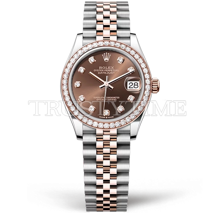 Часы Rolex из коллекции DateJust. Классические женские часы Rolex DateJust 31mm 278381RBR-0028 премиального качества (Артикул магазина: RX-3172) оснащены надежным автоматическим механизмом с автоподзаводом (работает от амплитуды движения руки) калибра ETA2824-2, в котором реализованы следующие функции: часовая, минутная и секундная стрелки, а так же дата. Круглый корпус часов комбинированного сталь с розового золота цвета, имеющий размер 31 мм и высоту 12 мм превосходно дополнит образ и украсит запястье своего обладателя. Для изготовления часов Rolex DateJust 31mm 278381RBR-0028 предлагаемых в нашем интернет-магазине, применяются нержавеющая сталь 904L высокого качества (Швейцарский стандарт), а так же сапфировое стекло высокой прочности, благодаря чему обеспечивается максимальная защита от сколов и механических повреждений. Отличительной чертой данной модели является коричневый циферблат, часовые индексы которого обеспечивают камни. Завершает образ браслет из нержавеющей стали комбинированного сталь с розовым золотом цвета с фирменной раскладывающейся застежкой Rolex. Водонепроницаемость данной модели составляет 30М (WR30) – допускается минимальное воздействие с водой.