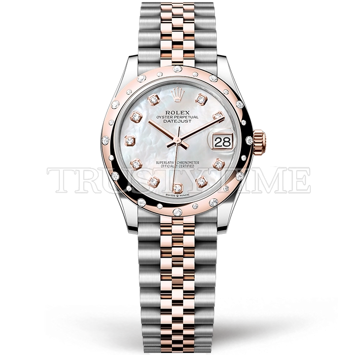 Часы Rolex из коллекции DateJust. Классические женские часы Rolex DateJust 31mm 278341RBR-0026 премиального качества (Артикул магазина: RX-3190) оснащены надежным автоматическим механизмом с автоподзаводом (работает от амплитуды движения руки) калибра ETA2824-2, в котором реализованы следующие функции: часовая, минутная и секундная стрелки, а так же дата. Круглый корпус часов комбинированного сталь с розового золота цвета, имеющий размер 31 мм и высоту 12 мм превосходно дополнит образ и украсит запястье своего обладателя. Для изготовления часов Rolex DateJust 31mm 278341RBR-0026 предлагаемых в нашем интернет-магазине, применяются нержавеющая сталь 904L высокого качества (Швейцарский стандарт), а так же сапфировое стекло высокой прочности, благодаря чему обеспечивается максимальная защита от сколов и механических повреждений. Отличительной чертой данной модели является перламутровый циферблат, часовые индексы которого обеспечивают камни. Завершает образ браслет из нержавеющей стали комбинированного сталь с розовым золотом цвета с фирменной раскладывающейся застежкой Rolex. Водонепроницаемость данной модели составляет 30М (WR30) – допускается минимальное воздействие с водой.