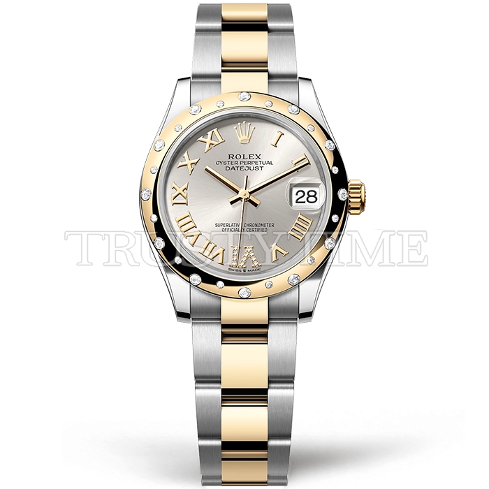 Часы Rolex из коллекции DateJust. Классические женские часы Rolex DateJust 31mm 278343RBR-0003 премиального качества (Артикул магазина: RX-3201) оснащены надежным автоматическим механизмом с автоподзаводом (работает от амплитуды движения руки) калибра ETA2836-2, в котором реализованы следующие функции: часовая, минутная и секундная стрелки, а так же дата. Круглый корпус часов комбинированного сталь с желтого золота цвета, имеющий размер 31 мм и высоту 12 мм превосходно дополнит образ и украсит запястье своего обладателя. Для изготовления часов Rolex DateJust 31mm 278343RBR-0003 предлагаемых в нашем интернет-магазине, применяются нержавеющая сталь 316F высокого качества (Швейцарский стандарт), а так же сапфировое стекло высокой прочности, благодаря чему обеспечивается максимальная защита от сколов и механических повреждений. Отличительной чертой данной модели является серебристый циферблат, часовые индексы которого обеспечивают римские цифры. Завершает образ браслет из нержавеющей стали комбинированного сталь с желтым золотом цвета с фирменной раскладывающейся застежкой Rolex. Водонепроницаемость данной модели составляет 30М (WR30) – допускается минимальное воздействие с водой.