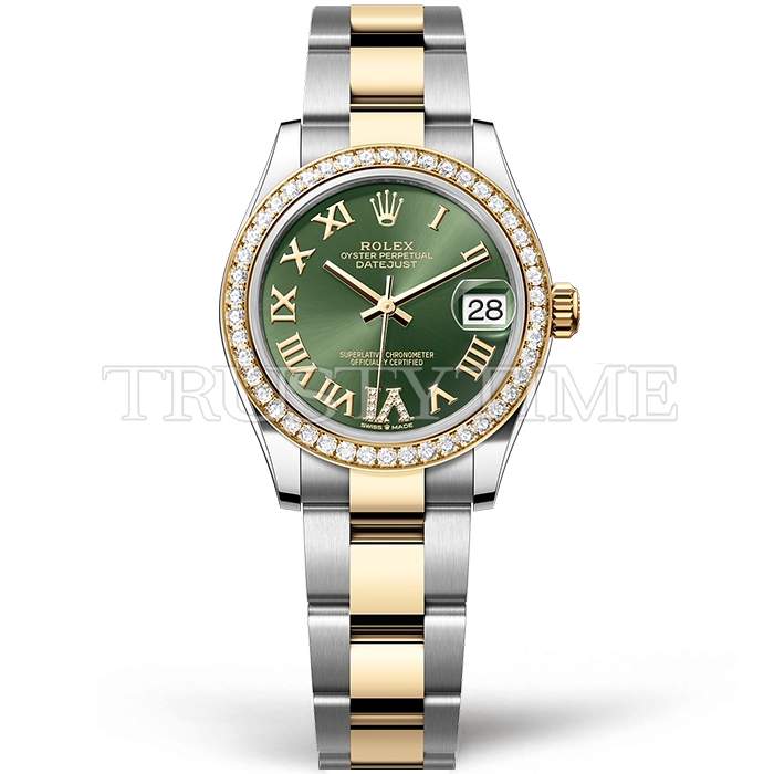 Часы Rolex из коллекции DateJust. Классические женские часы Rolex DateJust 31mm 278383RBR-0015 премиального качества (Артикул магазина: RX-3209) оснащены надежным автоматическим механизмом с автоподзаводом (работает от амплитуды движения руки) калибра ETA2836-2, в котором реализованы следующие функции: часовая, минутная и секундная стрелки, а так же дата. Круглый корпус часов комбинированного сталь с желтого золота цвета, имеющий размер 31 мм и высоту 12 мм превосходно дополнит образ и украсит запястье своего обладателя. Для изготовления часов Rolex DateJust 31mm 278383RBR-0015 предлагаемых в нашем интернет-магазине, применяются нержавеющая сталь 316F высокого качества (Швейцарский стандарт), а так же сапфировое стекло высокой прочности, благодаря чему обеспечивается максимальная защита от сколов и механических повреждений. Отличительной чертой данной модели является зеленый циферблат, часовые индексы которого обеспечивают римские цифры. Завершает образ браслет из нержавеющей стали комбинированного сталь с желтым золотом цвета с фирменной раскладывающейся застежкой Rolex. Водонепроницаемость данной модели составляет 30М (WR30) – допускается минимальное воздействие с водой.