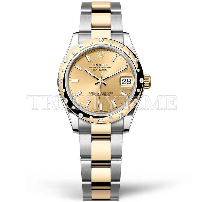 Часы Rolex из коллекции DateJust. Классические женские часы Rolex DateJust 31mm 278343RBR-0013 премиального качества (Артикул магазина: RX-3219) оснащены надежным автоматическим механизмом с автоподзаводом (работает от амплитуды движения руки) калибра ETA2836-2, в котором реализованы следующие функции: часовая, минутная и секундная стрелки, а так же дата. Круглый корпус часов комбинированного сталь с желтого золота цвета, имеющий размер 31 мм и высоту 12 мм превосходно дополнит образ и украсит запястье своего обладателя. Для изготовления часов Rolex DateJust 31mm 278343RBR-0013 предлагаемых в нашем интернет-магазине, применяются нержавеющая сталь 316F высокого качества (Швейцарский стандарт), а так же сапфировое стекло высокой прочности, благодаря чему обеспечивается максимальная защита от сколов и механических повреждений. Отличительной чертой данной модели является золотой циферблат, часовые индексы которого обеспечивают часовые метки. Завершает образ браслет из нержавеющей стали комбинированного сталь с желтым золотом цвета с фирменной раскладывающейся застежкой Rolex. Водонепроницаемость данной модели составляет 30М (WR30) – допускается минимальное воздействие с водой.