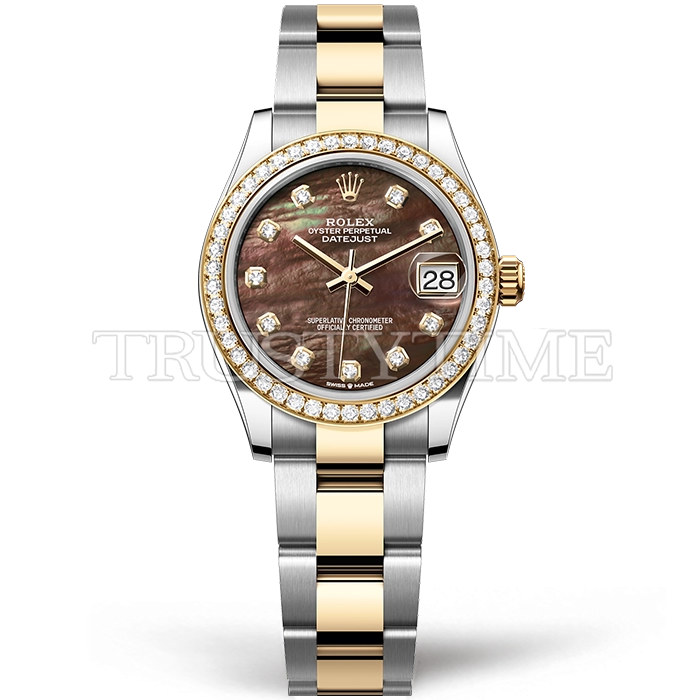 Часы Rolex из коллекции DateJust. Классические женские часы Rolex DateJust 31mm 278383RBR-0023 премиального качества (Артикул магазина: RX-3249) оснащены надежным автоматическим механизмом с автоподзаводом (работает от амплитуды движения руки) калибра ETA2824-2, в котором реализованы следующие функции: часовая, минутная и секундная стрелки, а так же дата. Круглый корпус часов комбинированного сталь с желтого золота цвета, имеющий размер 31 мм и высоту 12 мм превосходно дополнит образ и украсит запястье своего обладателя. Для изготовления часов Rolex DateJust 31mm 278383RBR-0023 предлагаемых в нашем интернет-магазине, применяются нержавеющая сталь 316F высокого качества (Швейцарский стандарт), а так же сапфировое стекло высокой прочности, благодаря чему обеспечивается максимальная защита от сколов и механических повреждений. Отличительной чертой данной модели является коричневый циферблат, часовые индексы которого обеспечивают камни. Завершает образ браслет из нержавеющей стали комбинированного сталь с желтым золотом цвета с фирменной раскладывающейся застежкой Rolex. Водонепроницаемость данной модели составляет 30М (WR30) – допускается минимальное воздействие с водой.