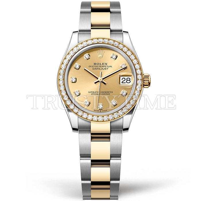 Часы Rolex из коллекции DateJust. Классические женские часы Rolex DateJust 31mm 278383RBR-0025 премиального качества (Артикул магазина: RX-3255) оснащены надежным автоматическим механизмом с автоподзаводом (работает от амплитуды движения руки) калибра ETA2836-2, в котором реализованы следующие функции: часовая, минутная и секундная стрелки, а так же дата. Круглый корпус часов комбинированного сталь с желтого золота цвета, имеющий размер 31 мм и высоту 12 мм превосходно дополнит образ и украсит запястье своего обладателя. Для изготовления часов Rolex DateJust 31mm 278383RBR-0025 предлагаемых в нашем интернет-магазине, применяются нержавеющая сталь 316F высокого качества (Швейцарский стандарт), а так же сапфировое стекло высокой прочности, благодаря чему обеспечивается максимальная защита от сколов и механических повреждений. Отличительной чертой данной модели является золотой циферблат, часовые индексы которого обеспечивают камни. Завершает образ браслет из нержавеющей стали комбинированного сталь с желтым золотом цвета с фирменной раскладывающейся застежкой Rolex. Водонепроницаемость данной модели составляет 30М (WR30) – допускается минимальное воздействие с водой.