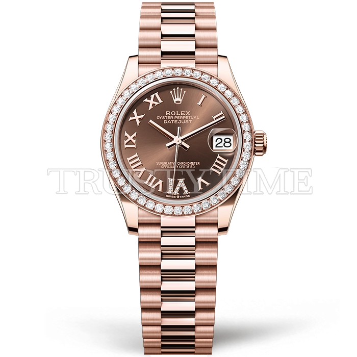 Часы Rolex из коллекции DateJust. Классические женские часы Rolex DateJust 31mm 278285RBR-0016 премиального качества (Артикул магазина: RX-3269) оснащены надежным автоматическим механизмом с автоподзаводом (работает от амплитуды движения руки) калибра ETA2824-2, в котором реализованы следующие функции: часовая, минутная и секундная стрелки, а так же дата. Круглый корпус часов розового цвета, имеющий размер 31 мм и высоту 12 мм превосходно дополнит образ и украсит запястье своего обладателя. Для изготовления часов Rolex DateJust 31mm 278285RBR-0016 предлагаемых в нашем интернет-магазине, применяются нержавеющая сталь 316F высокого качества (Швейцарский стандарт), а так же сапфировое стекло высокой прочности, благодаря чему обеспечивается максимальная защита от сколов и механических повреждений. Отличительной чертой данной модели является коричневый циферблат, часовые индексы которого обеспечивают римские цифры. Завершает образ браслет из нержавеющей стали цвета розового золота с фирменной раскладывающейся застежкой Rolex. Водонепроницаемость данной модели составляет 30М (WR30) – допускается минимальное воздействие с водой.