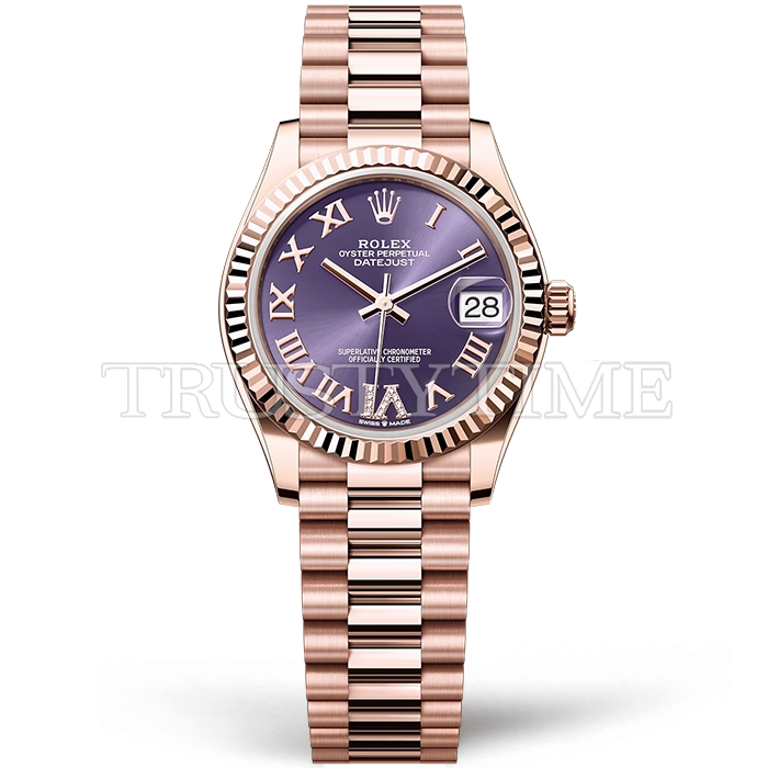Часы Rolex из коллекции DateJust. Классические женские часы Rolex DateJust 31mm 278275-0029 премиального качества (Артикул магазина: RX-3278) оснащены надежным автоматическим механизмом с автоподзаводом (работает от амплитуды движения руки) калибра ETA2824-2, в котором реализованы следующие функции: часовая, минутная и секундная стрелки, а так же дата. Круглый корпус часов розового цвета, имеющий размер 31 мм и высоту 12 мм превосходно дополнит образ и украсит запястье своего обладателя. Для изготовления часов Rolex DateJust 31mm 278275-0029 предлагаемых в нашем интернет-магазине, применяются нержавеющая сталь 316F высокого качества (Швейцарский стандарт), а так же сапфировое стекло высокой прочности, благодаря чему обеспечивается максимальная защита от сколов и механических повреждений. Отличительной чертой данной модели является фиолетовый циферблат, часовые индексы которого обеспечивают римские цифры. Завершает образ браслет из нержавеющей стали цвета розового золота с фирменной раскладывающейся застежкой Rolex. Водонепроницаемость данной модели составляет 30М (WR30) – допускается минимальное воздействие с водой.