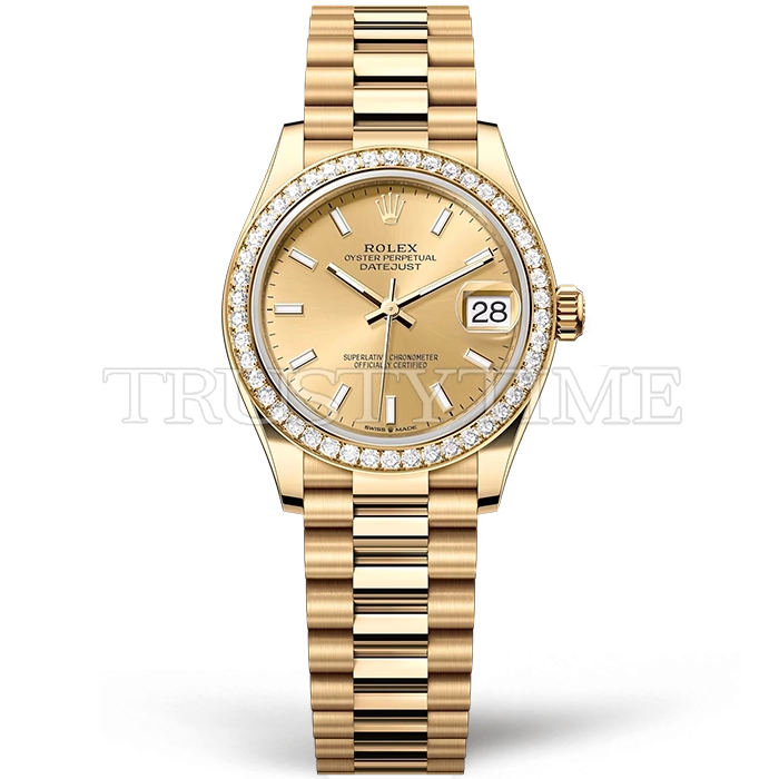 Часы Rolex из коллекции DateJust. Классические женские часы Rolex DateJust 31mm 278288RBR-0022 премиального качества (Артикул магазина: RX-3284) оснащены надежным автоматическим механизмом с автоподзаводом (работает от амплитуды движения руки) калибра ETA2824-2, в котором реализованы следующие функции: часовая, минутная и секундная стрелки, а так же дата. Круглый корпус часов цветы желтой золота, имеющий размер 31 мм и высоту 12 мм превосходно дополнит образ и украсит запястье своего обладателя. Для изготовления часов Rolex DateJust 31mm 278288RBR-0022 предлагаемых в нашем интернет-магазине, применяются нержавеющая сталь 316F высокого качества (Швейцарский стандарт), а так же сапфировое стекло высокой прочности, благодаря чему обеспечивается максимальная защита от сколов и механических повреждений. Отличительной чертой данной модели является золотой циферблат, часовые индексы которого обеспечивают часовые метки. Завершает образ браслет из нержавеющей стали цвета желтого золота с фирменной раскладывающейся застежкой Rolex. Водонепроницаемость данной модели составляет 30М (WR30) – допускается минимальное воздействие с водой.