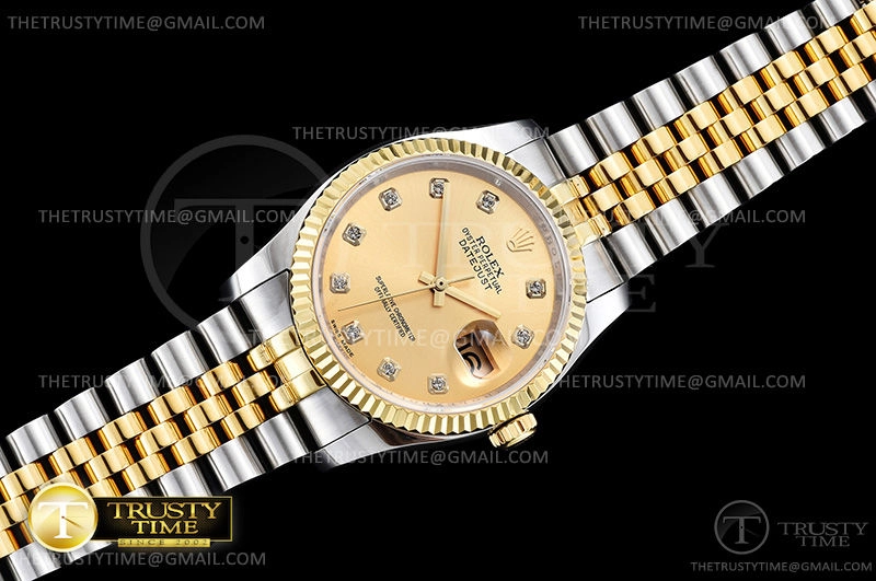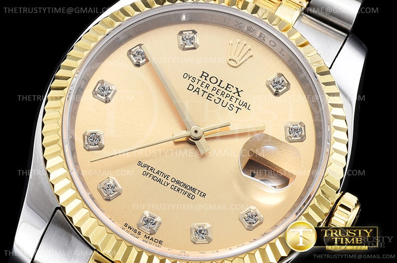 Часы Rolex из коллекции DateJust. Классические женские часы Rolex DateJust 36mm 116233-0150 премиального качества (Артикул магазина: RX-0514) оснащены надежным автоматическим механизмом с автоподзаводом (работает от амплитуды движения руки) калибра 3135, в котором реализованы следующие функции: часовая, минутная и секундная стрелки, а так же дата. Круглый корпус часов комбинированного сталь с желтого золота цвета, имеющий размер 36 мм и высоту 12 мм превосходно дополнит образ и украсит запястье своего обладателя. Для изготовления часов Rolex DateJust 36mm 116233-0150 предлагаемых в нашем интернет-магазине, применяются нержавеющая сталь 316F высокого качества (Швейцарский стандарт), а так же сапфировое стекло высокой прочности, благодаря чему обеспечивается максимальная защита от сколов и механических повреждений. Отличительной чертой данной модели является золотой циферблат, часовые индексы которого обеспечивают камни. Завершает образ браслет из нержавеющей стали комбинированного сталь с желтым золотом цвета с фирменной раскладывающейся застежкой Rolex. Водонепроницаемость данной модели составляет 30М (WR30) – допускается минимальное воздействие с водой.