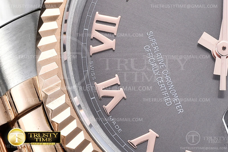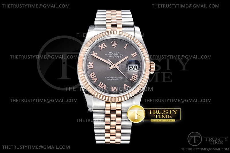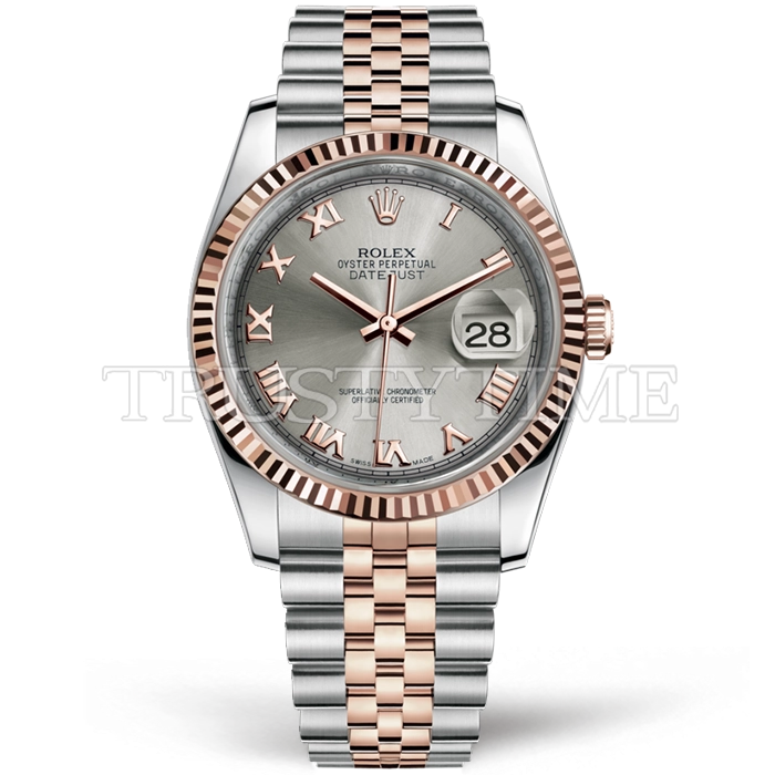 Часы Rolex из коллекции DateJust. Классические женские часы Rolex DateJust 36mm 116231-0087 премиального качества (Артикул магазина: RX-0504) оснащены надежным автоматическим механизмом с автоподзаводом (работает от амплитуды движения руки) калибра 3135, в котором реализованы следующие функции: часовая, минутная и секундная стрелки, а так же дата. Круглый корпус часов комбинированного сталь с розового золота цвета, имеющий размер 36 мм и высоту 12 мм превосходно дополнит образ и украсит запястье своего обладателя. Для изготовления часов Rolex DateJust 36mm 116231-0087 предлагаемых в нашем интернет-магазине, применяются нержавеющая сталь 316F высокого качества (Швейцарский стандарт), а так же сапфировое стекло высокой прочности, благодаря чему обеспечивается максимальная защита от сколов и механических повреждений. Отличительной чертой данной модели является серый циферблат, часовые индексы которого обеспечивают римские цифры. Завершает образ браслет из нержавеющей стали комбинированного сталь с розовым золотом цвета с фирменной раскладывающейся застежкой Rolex. Водонепроницаемость данной модели составляет 30М (WR30) – допускается минимальное воздействие с водой.