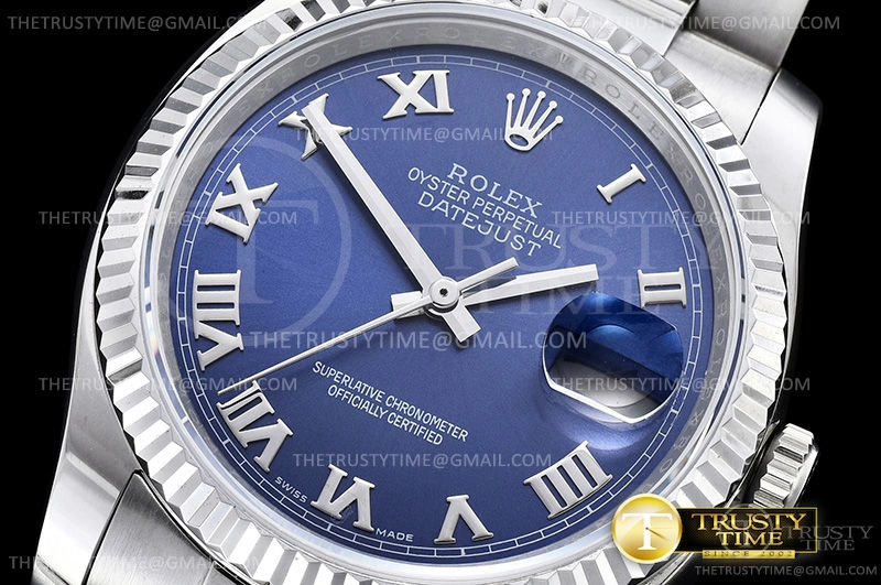 Часы Rolex из коллекции DateJust. Классические женские часы Rolex DateJust 36mm 116234-0133 премиального качества (Артикул магазина: RX-0489) оснащены надежным автоматическим механизмом с автоподзаводом (работает от амплитуды движения руки) калибра 3135, в котором реализованы следующие функции: часовая, минутная и секундная стрелки, а так же дата. Круглый корпус часов стального цвета, имеющий размер 36 мм и высоту 12 мм превосходно дополнит образ и украсит запястье своего обладателя. Для изготовления часов Rolex DateJust 36mm 116234-0133 предлагаемых в нашем интернет-магазине, применяются нержавеющая сталь 316F высокого качества (Швейцарский стандарт), а так же сапфировое стекло высокой прочности, благодаря чему обеспечивается максимальная защита от сколов и механических повреждений. Отличительной чертой данной модели является синий циферблат, часовые индексы которого обеспечивают римские цифры. Завершает образ браслет из нержавеющей стали стального цвета с фирменной раскладывающейся застежкой Rolex. Водонепроницаемость данной модели составляет 30М (WR30) – допускается минимальное воздействие с водой.
