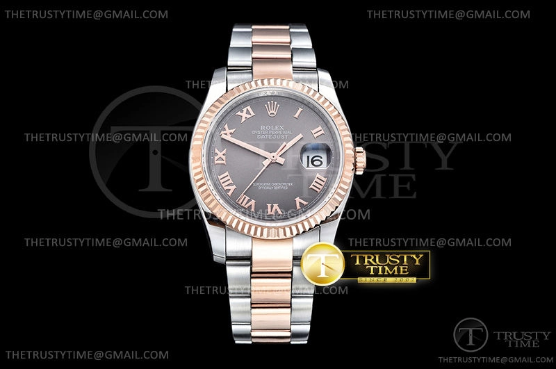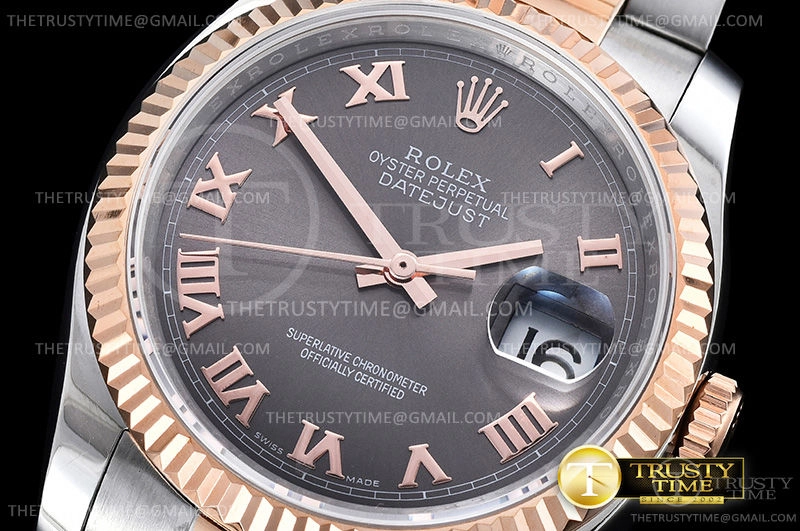 Часы Rolex из коллекции DateJust. Классические женские часы Rolex DateJust 36mm 116231-0069 премиального качества (Артикул магазина: RX-0483) оснащены надежным автоматическим механизмом с автоподзаводом (работает от амплитуды движения руки) калибра 3135, в котором реализованы следующие функции: часовая, минутная и секундная стрелки, а так же дата. Круглый корпус часов комбинированного сталь с розового золота цвета, имеющий размер 36 мм и высоту 12 мм превосходно дополнит образ и украсит запястье своего обладателя. Для изготовления часов Rolex DateJust 36mm 116231-0069 предлагаемых в нашем интернет-магазине, применяются нержавеющая сталь 316F высокого качества (Швейцарский стандарт), а так же сапфировое стекло высокой прочности, благодаря чему обеспечивается максимальная защита от сколов и механических повреждений. Отличительной чертой данной модели является серый циферблат, часовые индексы которого обеспечивают римские цифры. Завершает образ браслет из нержавеющей стали комбинированного сталь с розовым золотом цвета с фирменной раскладывающейся застежкой Rolex. Водонепроницаемость данной модели составляет 30М (WR30) – допускается минимальное воздействие с водой.