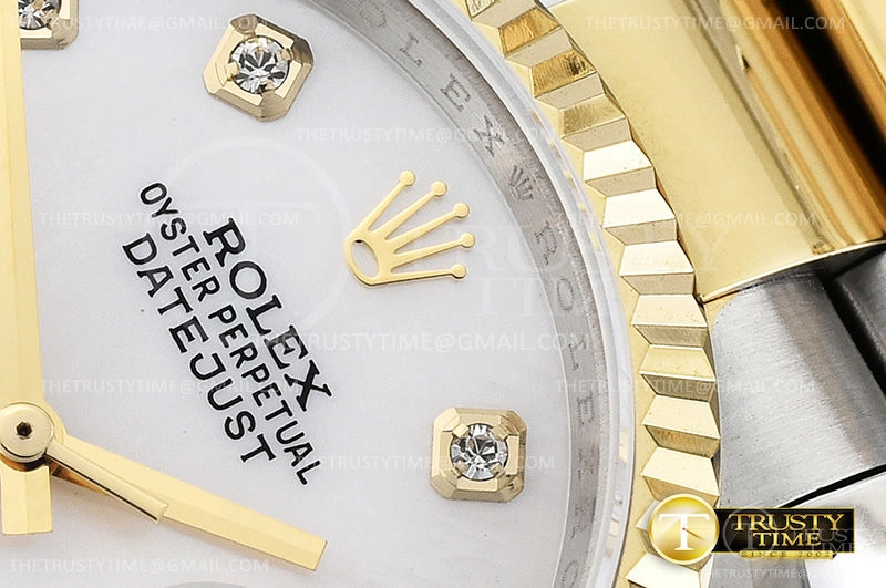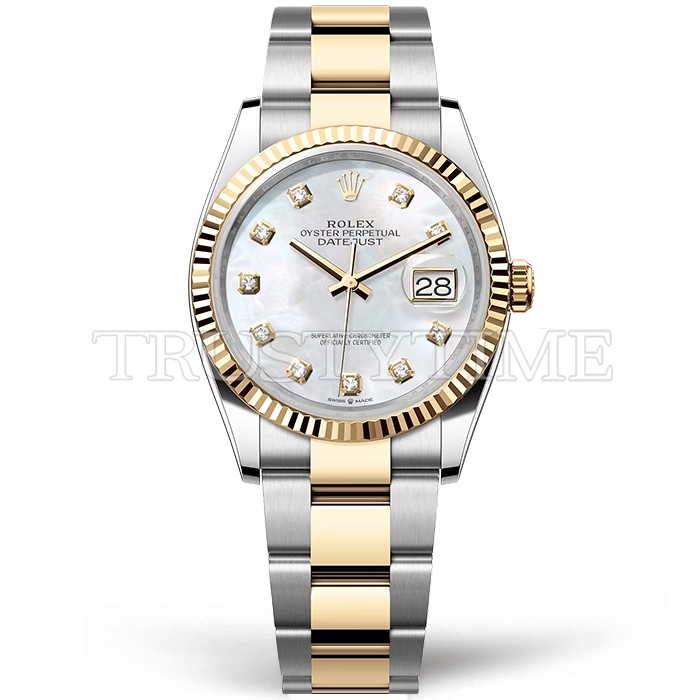 Часы Rolex из коллекции DateJust. Классические женские часы Rolex DateJust 36mm 126233-0024 премиального качества (Артикул магазина: RX-0462) оснащены надежным автоматическим механизмом с автоподзаводом (работает от амплитуды движения руки) калибра 3135, в котором реализованы следующие функции: часовая, минутная и секундная стрелки, а так же дата. Круглый корпус часов комбинированного сталь с желтого золота цвета, имеющий размер 36 мм и высоту 12 мм превосходно дополнит образ и украсит запястье своего обладателя. Для изготовления часов Rolex DateJust 36mm 126233-0024 предлагаемых в нашем интернет-магазине, применяются нержавеющая сталь 316F высокого качества (Швейцарский стандарт), а так же сапфировое стекло высокой прочности, благодаря чему обеспечивается максимальная защита от сколов и механических повреждений. Отличительной чертой данной модели является перламутровый циферблат, часовые индексы которого обеспечивают камни. Завершает образ браслет из нержавеющей стали комбинированного сталь с желтым золотом цвета с фирменной раскладывающейся застежкой Rolex. Водонепроницаемость данной модели составляет 30М (WR30) – допускается минимальное воздействие с водой.