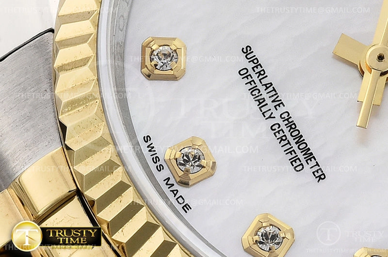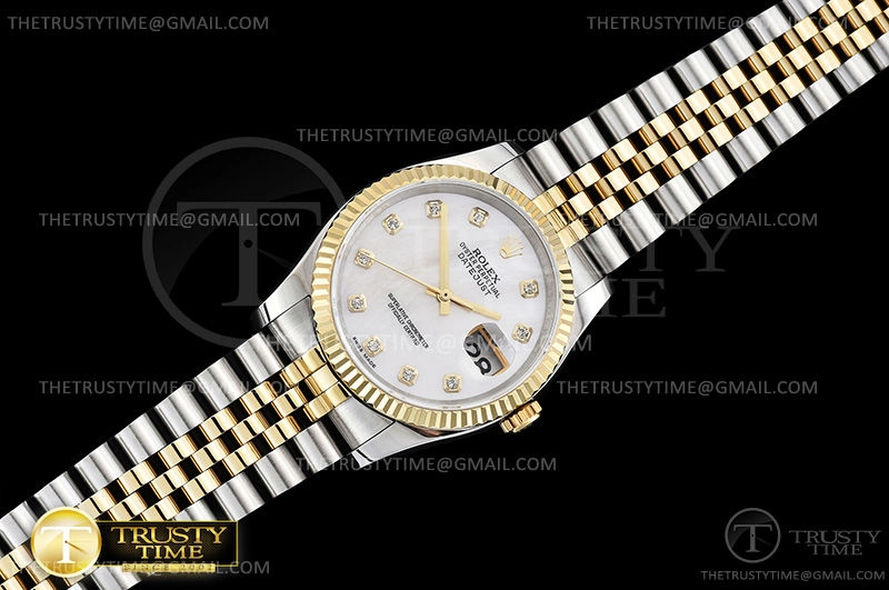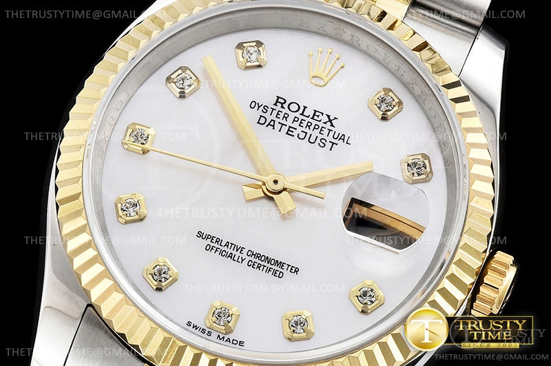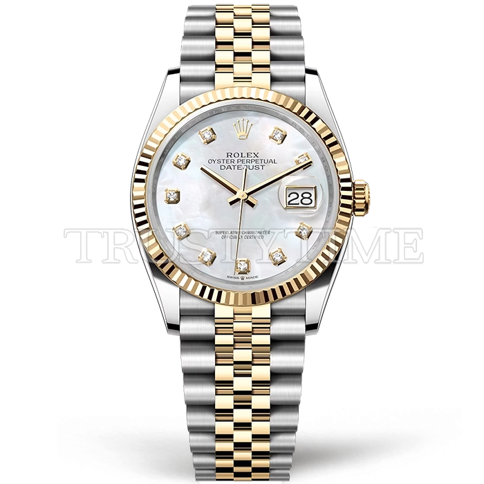 Часы Rolex из коллекции DateJust. Классические женские часы Rolex DateJust 36mm 126233-0023 премиального качества (Артикул магазина: RX-0464) оснащены надежным автоматическим механизмом с автоподзаводом (работает от амплитуды движения руки) калибра 3135, в котором реализованы следующие функции: часовая, минутная и секундная стрелки, а так же дата. Круглый корпус часов комбинированного сталь с желтого золота цвета, имеющий размер 36 мм и высоту 12 мм превосходно дополнит образ и украсит запястье своего обладателя. Для изготовления часов Rolex DateJust 36mm 126233-0023 предлагаемых в нашем интернет-магазине, применяются нержавеющая сталь 316F высокого качества (Швейцарский стандарт), а так же сапфировое стекло высокой прочности, благодаря чему обеспечивается максимальная защита от сколов и механических повреждений. Отличительной чертой данной модели является перламутровый циферблат, часовые индексы которого обеспечивают камни. Завершает образ браслет из нержавеющей стали комбинированного сталь с желтым золотом цвета с фирменной раскладывающейся застежкой Rolex. Водонепроницаемость данной модели составляет 30М (WR30) – допускается минимальное воздействие с водой.